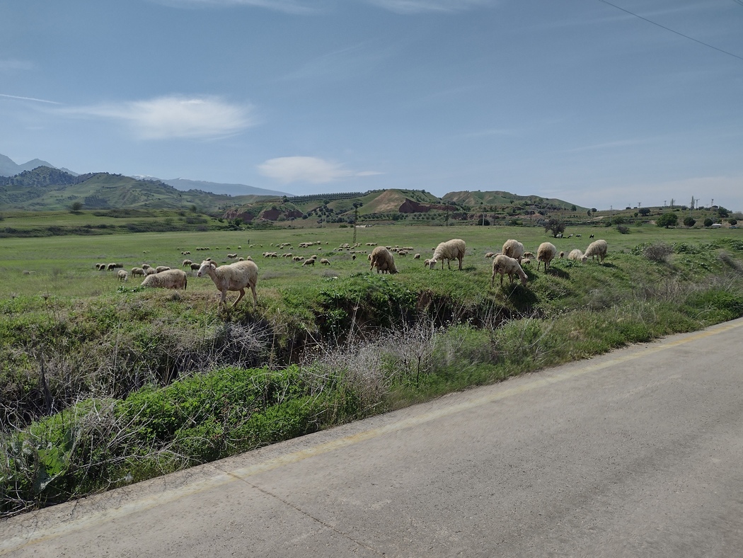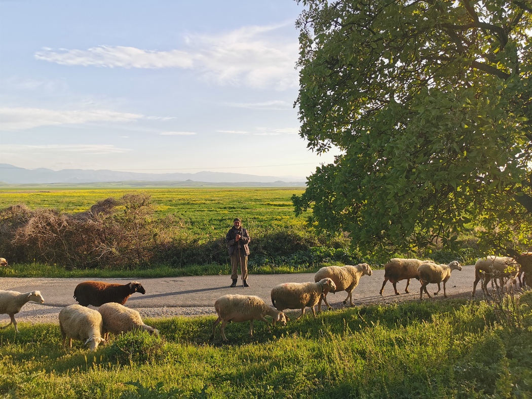 Als wir unser Abendessen beendet hatten kam der Schäfer samt seine Herde um die Ecke und lies diese rund um uns herum grasen. Gerne wollte er auch ein wenig mit uns plaudern, aber natürlich gelang das nicht wirklich. Als Geste des Dankes für die edle Wasserspende schenkten wir ihm eine Packung Datteln, die entgegen des weit überwiegenden Teil unserer bisherigen Erfahrungen zum Glück auch angenommen wurde. Daraufhin zog er mit seinen Schafen von dannen.