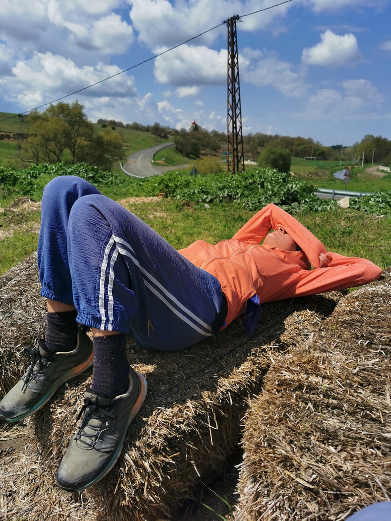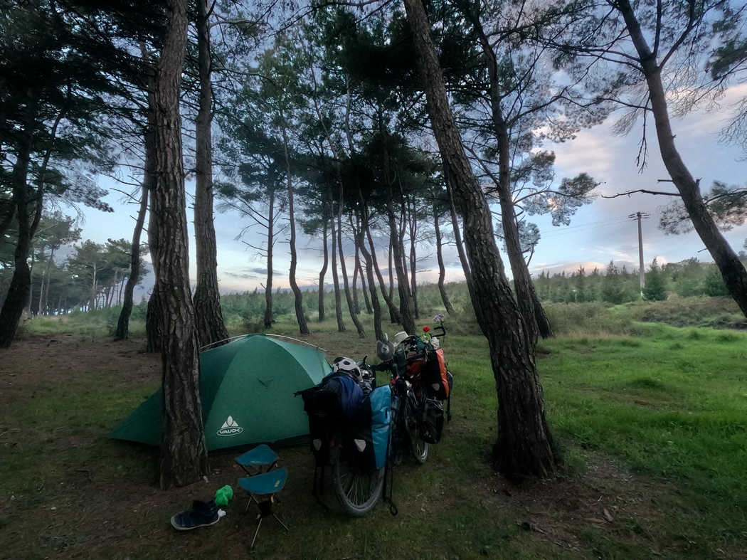 Kurz hinter der Stadt Soma fanden wir dann endlich mal wieder einen nahezu perfekten Zeltplatz. Zwar war der Tag noch recht jung, andererseits hatten wir bereits über 90 km hinter uns gebracht und der Platz hatte zu viel auf der Haben-Seite: Es gab fließendes Wasser, davor einen gepflasterten Bereich mit tischähnlichen Gebilden und ein kleines Wäldchen, dass ein taufreies Außenzelt versprach. Zudem war der Ort ziemlich abgelegen, nur eine Schotterpiste hatte uns hierher geführt. Wir beschlossen also zu bleiben und nutzten das fließende Wasser für eine ausgiebige Wäsche unserer selbst und einiger Kleidungsstücke, die wir an den zur Weinbändigung gespannten Drähten aufhängen konnten und die in Sonnenschein und leichtem Wind auch noch bis zum Abend trocknete. Ein wahrer Traum. Das dachte sich auch der Krebs, der in dem Wasserbecken lebte bis wir ihn mit einem Stöcklein traktierten, in das er sich sogleich mit aller Kraft festzwickte.
