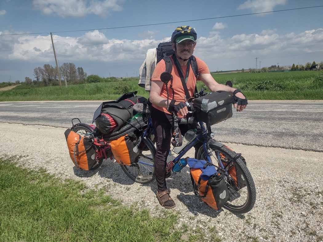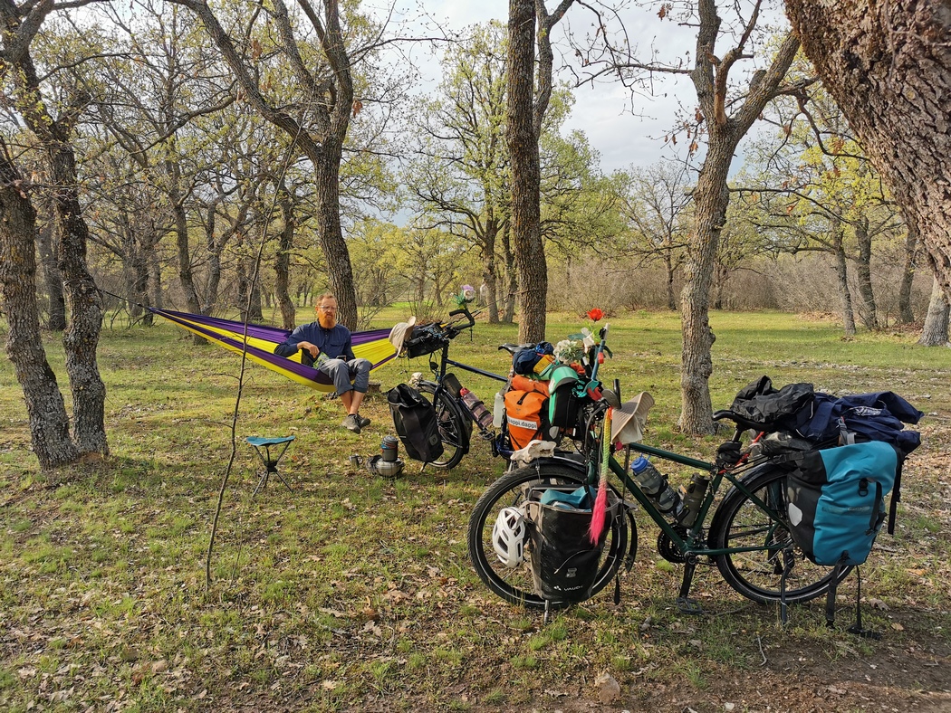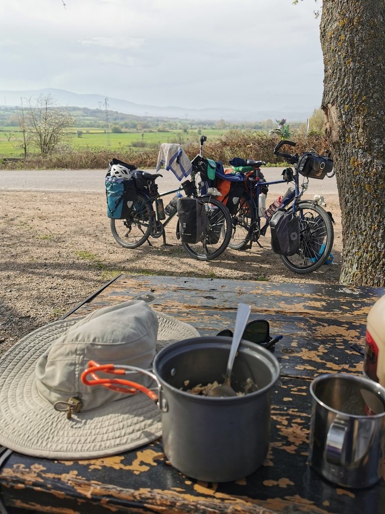 Ja, technisch betrachtet war Peter auch Radreisender (ebenfalls mit einem Patria unterwegs) aber bei den Massen von Gepäck die er mitschleppte, musste man schon zweimal hinschauen, um sich dessen gewahr zu werden. Nicht nur hatte er 5 prall gefüllte Ortlieb Taschen (wie es noch nicht unbedingt unüblich ist) am Rad, auch zog er einen voll beladenen Anhänger hinter sich her, was wir so gut wie nie sahen, da das wohl die meisten Radfahrer*innen wie wir, sehr unpraktisch finden. Als wäre es damit aber noch nicht genug saß ihm ein 80 Liter Rucksack auf dem Rücken und zur Krönung hatte er noch eine Spiegelreflexkamera um den Hals hängen. Wir fühlten uns sogleich an Frank erinnert, der uns zum Titel unseres Berichts über unser Workaway in Georgien inspiriert hatte.