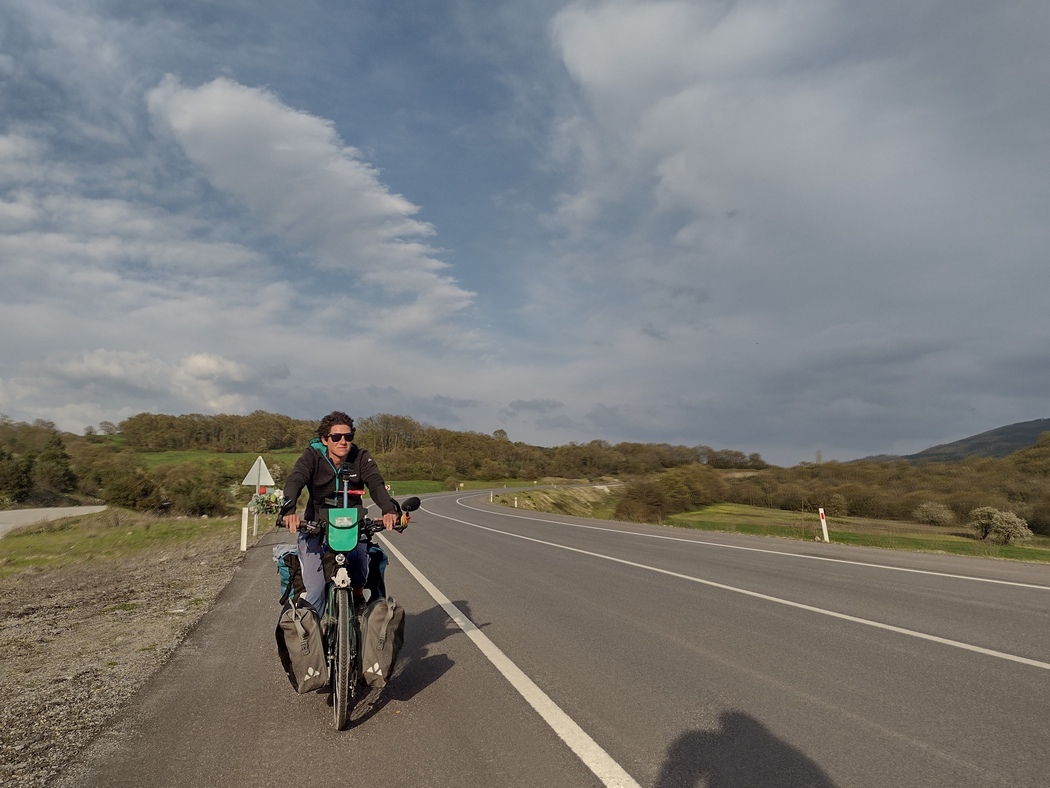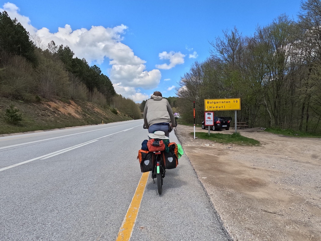 Von hier aus waren es nur noch etwa 45 km durch mittlerweile landschaftliche attraktivere Hügel bis zur bulgarischen Grenze. Belustigt sahen wir zehn Kilometer vor eben jener das Hinweisschild auf eben jene: „Bulgaristan 10 km“! Es ging bis dahin mal wieder ordentlich bergauf durch frühlingsfrisch grüne Buchenwälder und eigentlich sah es für den Moment schon fast wieder aus wie im Kleinen Odenwald oder im Bergischen Land. An der Grenze angekommen, drängelten wir uns in bewährter Manier einfach vor, was aufgrund der Harmlosigkeit unserer fahrbaren Untergestelle allgemein akzeptiert wurde. Die türkischen Grenzbeamten ließen uns nach einem beiläufigen Durchblättern unserer Pässe ohne weitere Fragen passieren und wir waren im Begriff in die EU zurück zu kehren, die wir an Tilmanns 38tem Geburtstag vor fast einem Jahr verlassen hatten.