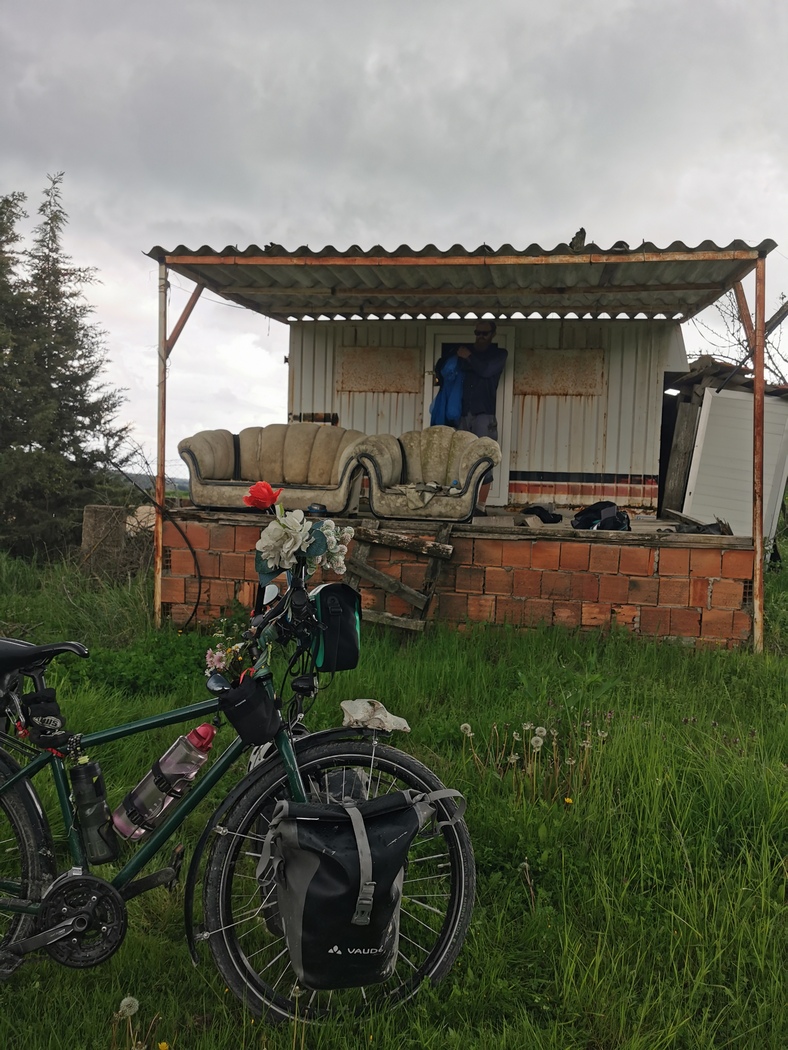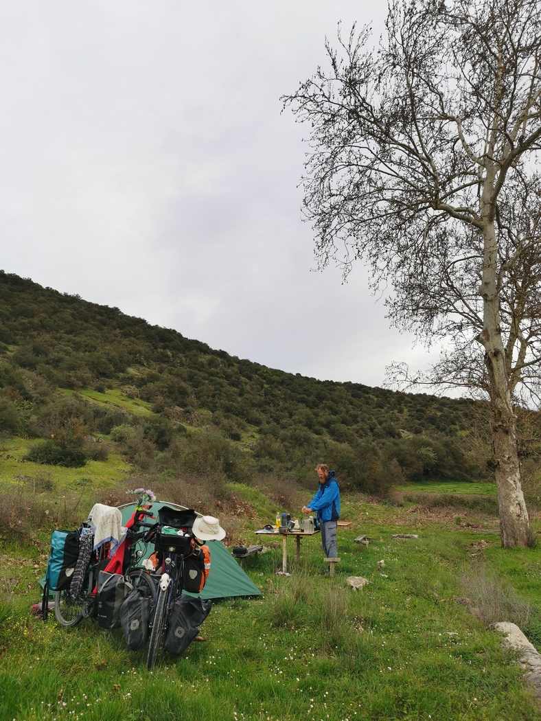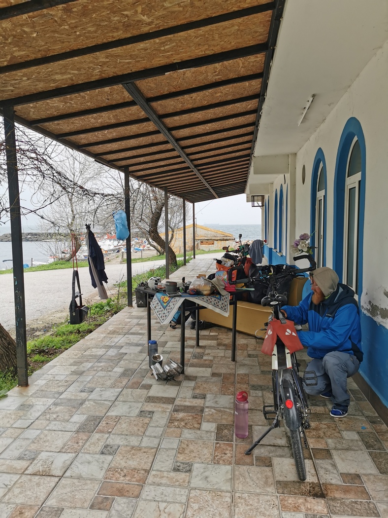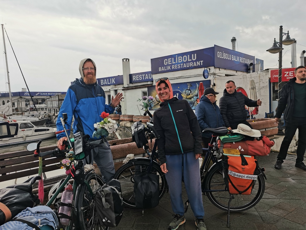 Nachdem wir nun innerhalb von vier Tagen knapp 390 km gemacht hatten, konnten wir getrost einen halben Ruhetag einlegen. Bei Wind und reichlich ungemütlichen Temperaturen erreichten wir am 18. April die Dardanellen. Wenig später, es war erst Mittag und das Wetter lud nun eigentlich gar nicht zum Verweilen ein, schlugen wir auf der Terrasse eines verlassenen Strandcafés schon unser Lager auf. Der Grund war, dass Team Bike and Free uns entgegen kam, die nachdem wir sie erstmalig in Israel getroffen hatten, durch Griechenland und Bulgarien und nun auf dem Weg nach Istanbul waren. Inzwischen hatten sie Verstärkung durch der David erhalten, der sie von Thessaloniki bis an den Bosporus begleitete.