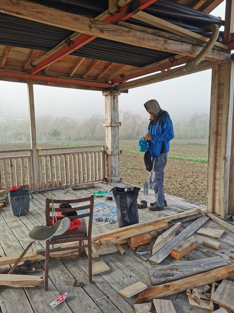 Aufgrund einiger zweifelhafter architektonischer Entscheidungen hatte es in den Schlafraum kräftig herein geregnet und nachdem wir das Wasser mit einem alten T-Shirt aufgewischt hatten, hatten wir natürlich das Problem nicht lösen können, dass das grelle Licht der Straßenlaterne auf unsere spiegelglatten Schlafpritschen schien, auf denen die Luftmatratzen einfach keinen Halt fanden. Wegen der bereichernden Erfahrungen zwischenmenschlicher Art vor einem Jahr, hatten wir verdrängt, dass die Unterkunft ohne andere Gäste unterm Strich zwar immer noch mehr Vor- als Nachteile bot, wir in unserem Zelt aber tatsächlich angenehmer schlafen konnten.
