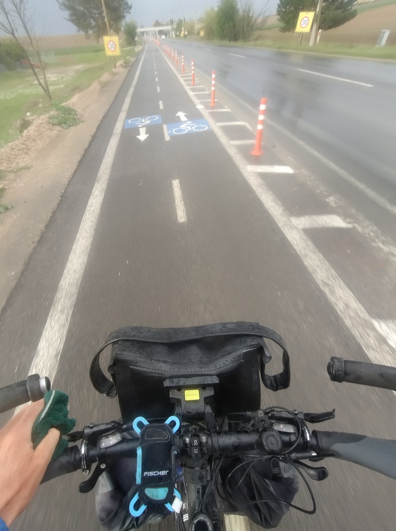 Natürlich setze bald wieder der Regen ein, soweit alles beim Alten, allerdings gab es inzwischen Neuigkeiten auf der Straße. Die von Süden nach Lüleburgaz führende Straße, die wir verkehrstechnisch noch in schlechter Erinnerung hatten, verfügte inzwischen über einen Fahrradweg. Die Freude darüber währte allerdings nicht lange, da dieser ordentlich eingesandet war. Kombiniert mit Regen ergibt sich so leider immer eine besonders explosive Mischung, die sich sofort auf dem Antriebsstrang einnistet, dass es nur so rattert und die Kette auf dem Ritzel Samba tanzte. Tilmann ärgerte sich standesgemäß und fuhr wieder auf die Straße zurück, wo er dann erwartungsgemäß angehubt wurde.