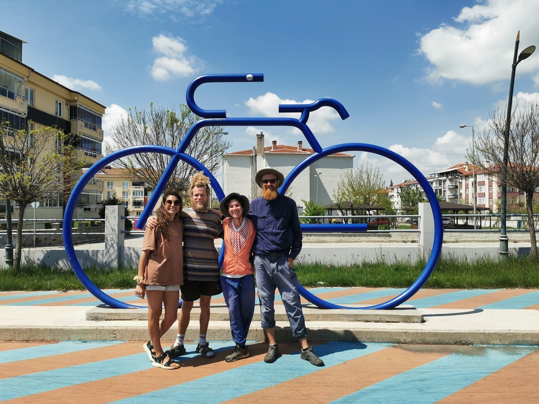 Als wir zurück in unserem Quartier waren, war die Zeit der Einsamkeit Geschichte. Lauren und Laurien vom Team lolotandemadventures waren inzwischen mit ihrem Tandem eingetroffen. In England vor einem Jahr in Richtung Osten mit dem Fernziel Weltumrundung (ebenfalls ohne Flugzeug!) gestartet, hatten sie in Zypern fürs erste die Segel gestrichen und waren wie wir nun erst einmal auf dem Rückweg. Allerdings wollen sie nach einem kurzen Zwischenstopp Zuhause bald weiter nach Portugal in der Hoffnung dort ein Schiff für die Atlantiküberquerung zu finden. Sie waren dann auch die ersten Radreisenden die wir trafen, die eine konsequente Nicht-Fliegen-Politik verfolgten. Lauren wurde am Abend zu diesem Reisestil von einer Wissenschaftlerin der Universität Lund interviewt, die dazu forschte. Wir verbrachten jedenfalls einen angenehmen gemeinsamen Abend und grämten uns nicht, dass unsere traute Zweisamkeit nun gestört worden war.