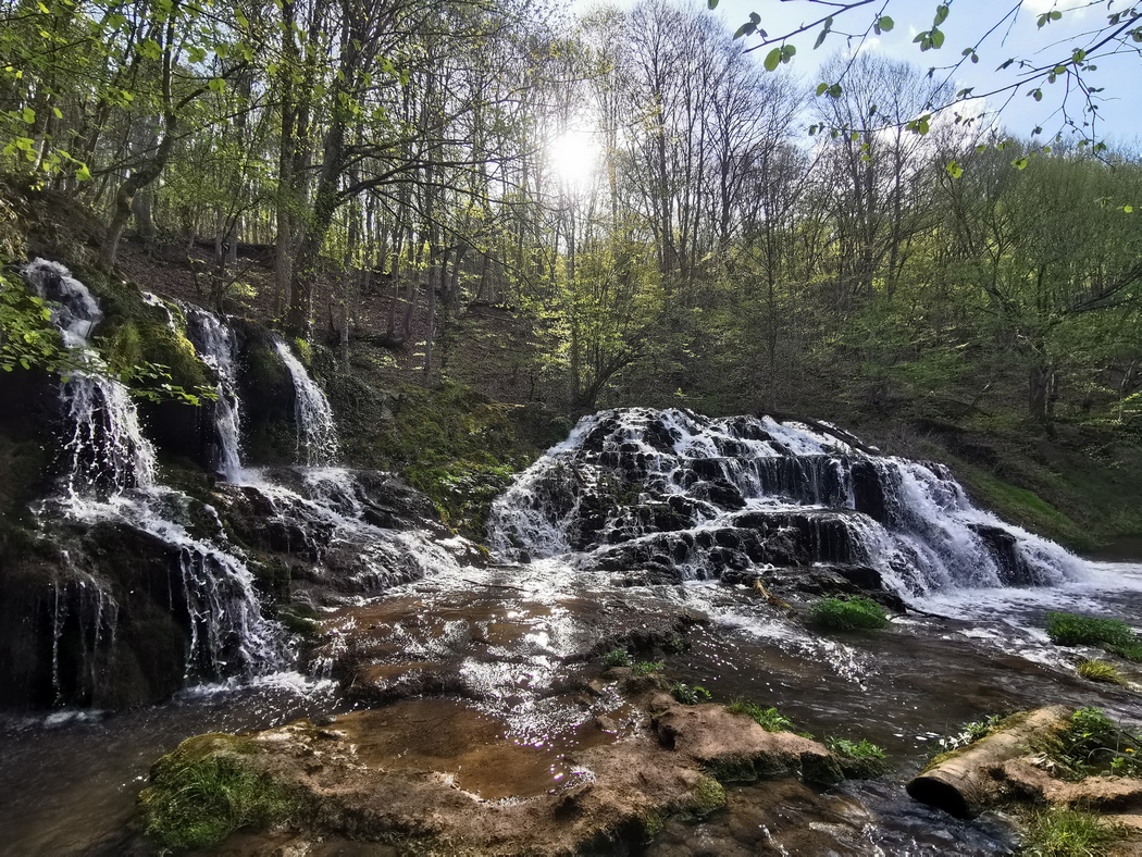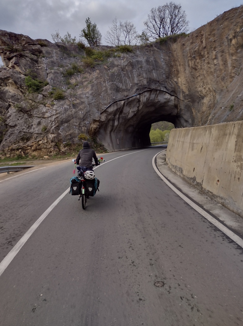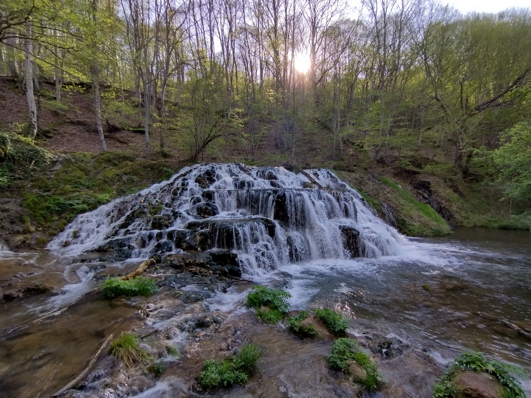 Wir rollten jedenfalls in aller Seelenruhe den Berg hinab, während links und rechts der im frischen Grün der jungen Blätter erstrahlende Wald an uns vorbei flog. Nach 9 km verließen wir die Hauptstraße, da wir den Dokuzak-Wasserfall ansteuerten, den wir uns als Schlafplatz vorgemerkt hatten.