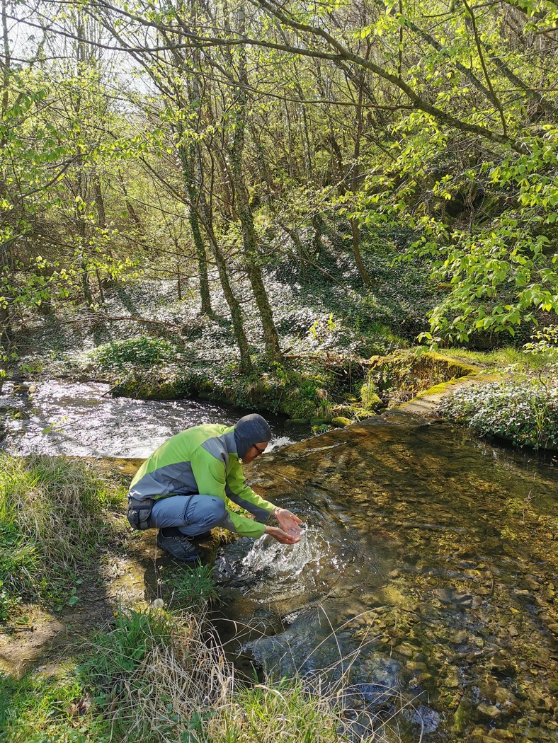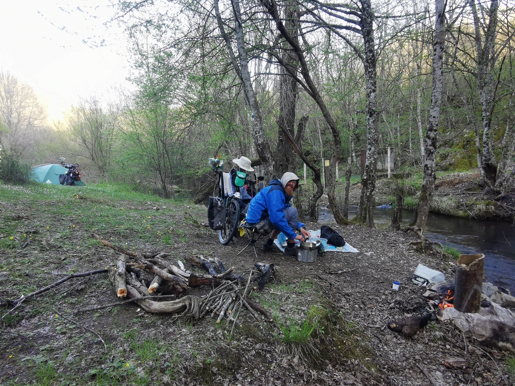 Schließlich fanden wir eine kleine Wiese in einer Biegung eines kristallklaren Flusses mit der wir zufrieden waren. Es war nun wirklich schon recht frisch und so entfachten wir wieder einmal ein Feuer, was wir weite Teile der Reise abgelehnt hatten. Die Idee in unserem Wassersack Waschwasser zu erwärmen, indem wir ihn in dessen Nähe stellten, erwies sich als große Torheit, was wir feststellten, als dieser begann eine große Blase auszubilden. Er war zwar noch nicht undicht aber wir waren gar nicht so unglücklich dass wir ihn dennoch bald aussortieren werden müssten, da er immer schon recht unpraktisch gewesen war. Immerhin hatten die beiden Hatta-Flaschen das Wärmebad neben dem Feuer überstanden und wir konnten uns, nachdem wir uns mit dem eiskalten Waschlappen abgerieben hatten noch einmal heiß abduschen.