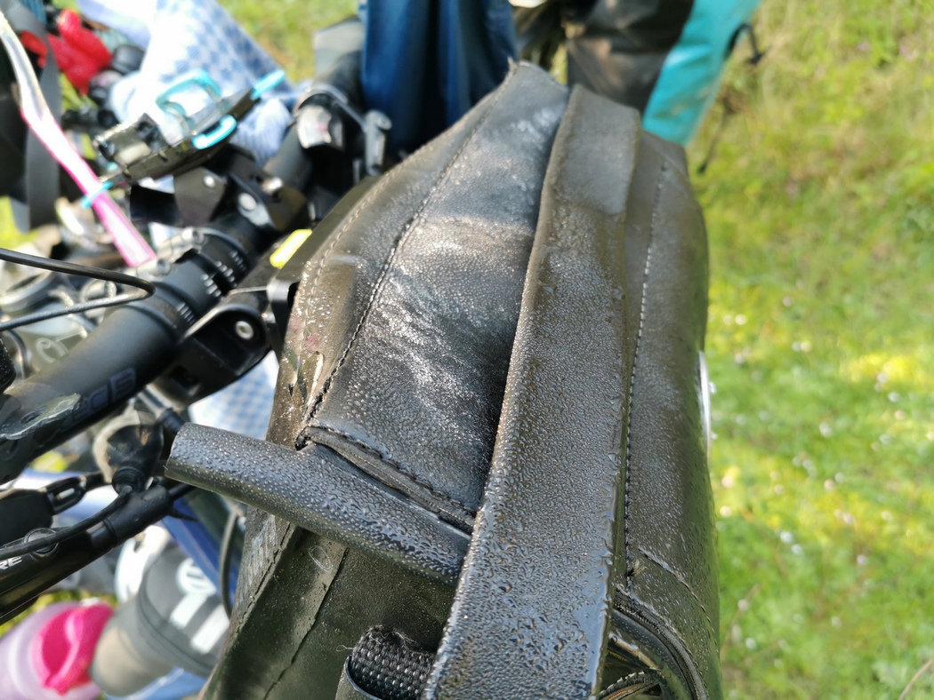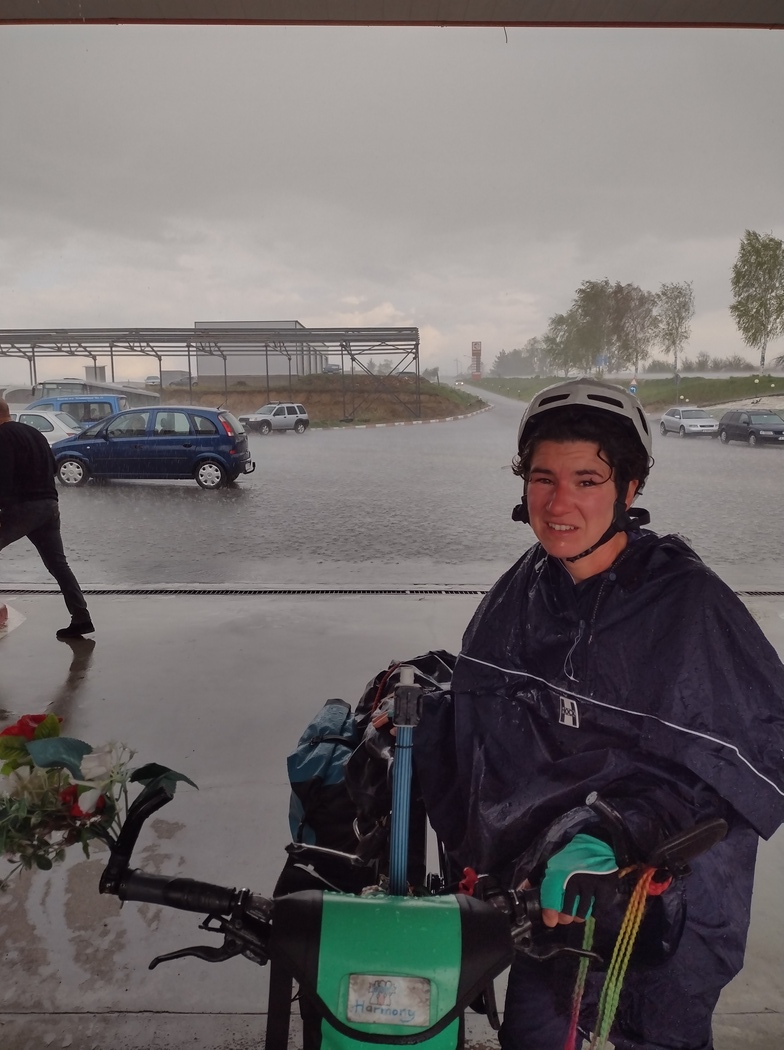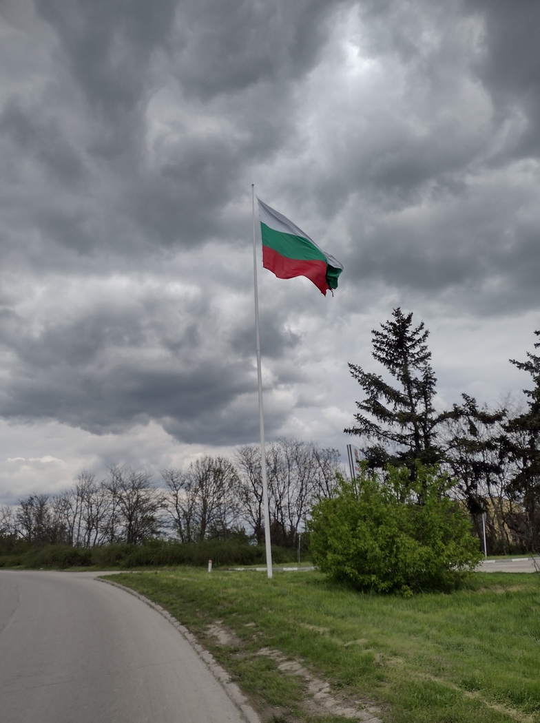 Kurz hinter Burgas, wir hatten uns gerade eine Pizza und einen Automatenkaffee (Kaffeeautomaten stehen in Bulgarien buchstäblich an jeder Ecke) gegönnt mussten wir einen zwar relativ hohen, aber moderat ansteigenden Berg erklimmen. Auf dem Weg nach oben zog sich der Himmel bedrohlich zu und kurz vor dem Gipfel begann es leicht zu tröpfeln. Wir zogen daher vorsichtshalber unsere Regensachen an, wobei Julia davon absah auch ihre Regenhose überzustreifen, da es ja nur leicht tröpfelte.
