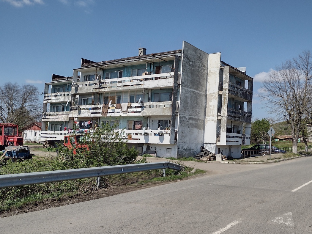 Auf dem Weg nach Burgas fuhren wir weiter durch eine Reihe recht trostlos erscheinender Ortschaften mit maroder alter Bausubstanz, maroden Plattenbauten und viel Leerstand. Aber immerhin gab es in jedem noch so kleinen Örtchen ein zentrales Plätzchen, an dem ein vermutlich ehemaliges Verwaltungsgebäude lag und das mit Bänken neben Rabatten zu Verweilen einlud. Ein bisschen Leben war dort immer zu finden. Hin und wieder sah man auch eine Moschee, denn immerhin knapp 9 % der Bevölkerung in Bulgarien sind Türken.