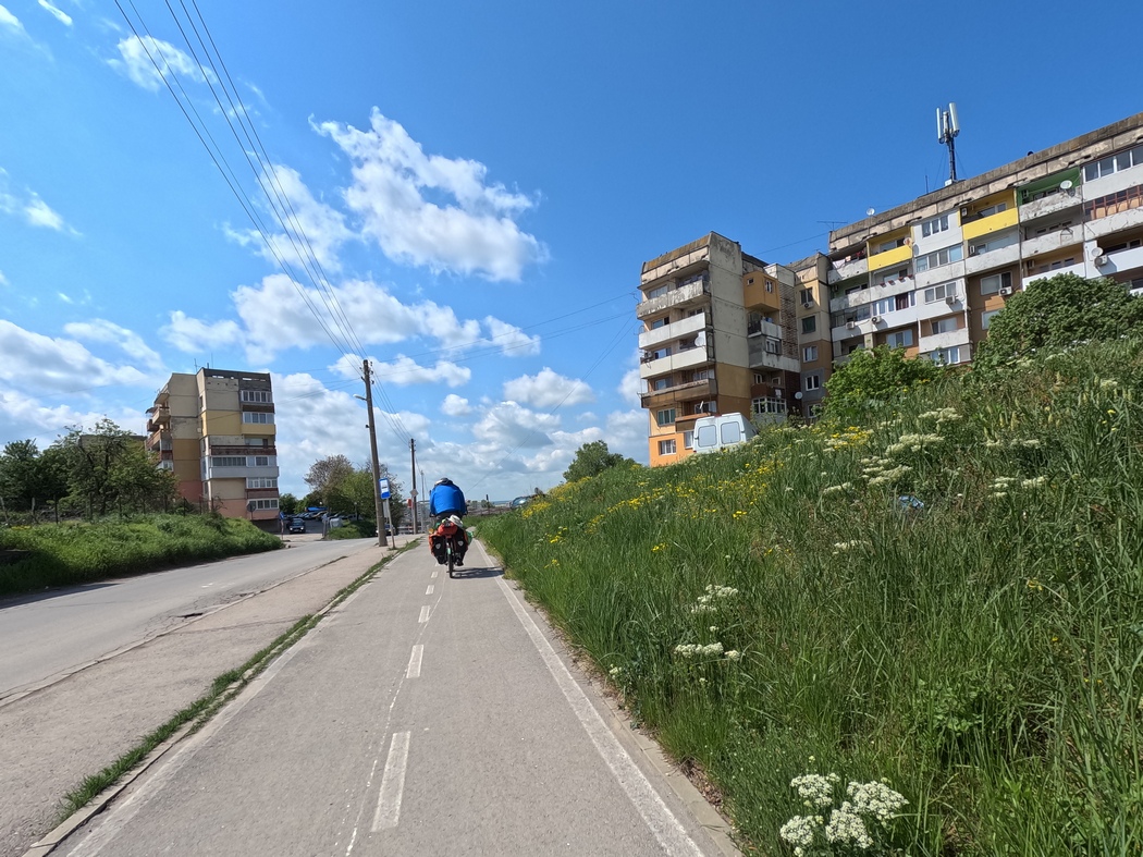 Unser Tagesziel war die am Schwarzen Meer gelegene viertgrößte Stadt des Landes, Burgas. Auf Empfehlung von Lauren und Laurien vom Team @lolotandemadventures sowie dem Manager der Fahrrad-Akademie von Lüleburgaz wollten wir bei einem (weiteren) sogenannten Superhost (so nennt man unter Radreisenden eben jene Gastgeber, die auf der Vagabundenwunschliste keine unabgehakte Zeile übrig lassen) unterkommen. Jevgeni betreibt in der Stadt das „Hug Hostel“, bei dem Radreisende umsonst unterkommen konnten. Erst Wochen später, als wir zufällig Kontakt mit Max hatten, den wir vor einem Jahr in Lüleburgaz getroffen hatten, fiel uns ein, dass er damals auch berichtet hatte, dort gewesen zu sein und den weltberühmten zu Fuß reisenden Christoph Rehage getroffen hatte (Christoph hatte ihm damals seinen „Aluminium-Karren“ gezeigt, den er sich in China hatte konstruieren lassen, wobei Max ihn auf den orange-roten Rost an eben jenem hingewiesen hatte, was bei ihm offenbar bisher keine Fragen über das tatsächlich verwendete Material aufgeworfen hatte.)