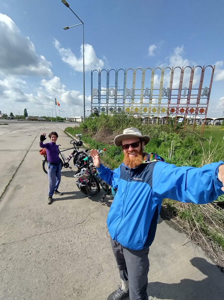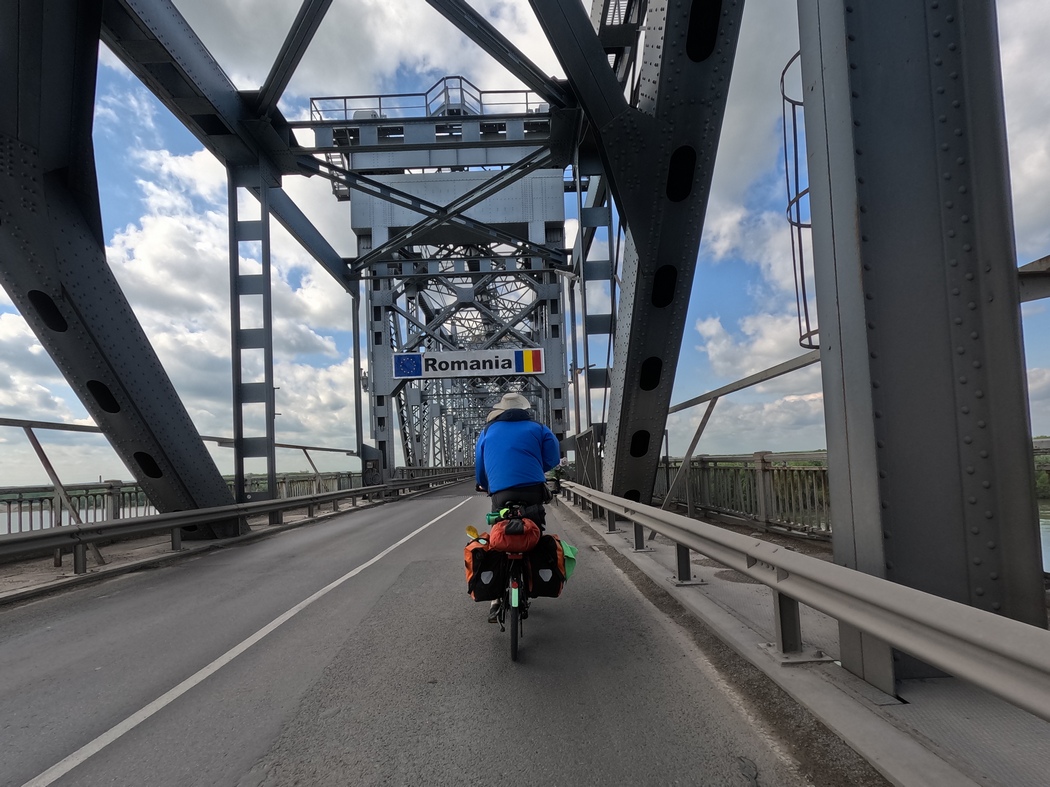 Wir nahmen nun vollen Kurs auf die Rumänische Grenze, die wir am frühen Nachmittag in Russe an der Donau erreichten. Die Umgehungsstraße, die uns zur Giurgiu-Russe-Freundschaftsbrücke von 1954 führte war der reinste Albtraum, und so waren wir erleichtert, als diese vorbei war und wir bei strahlendem Sonnenschein die Rampe hinauffuhren. In der Mitte der Donau hatten wir Rumänien erreicht, das 22. Land auf unserem Trip.