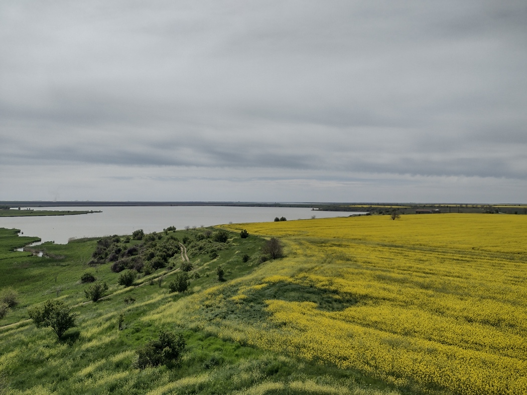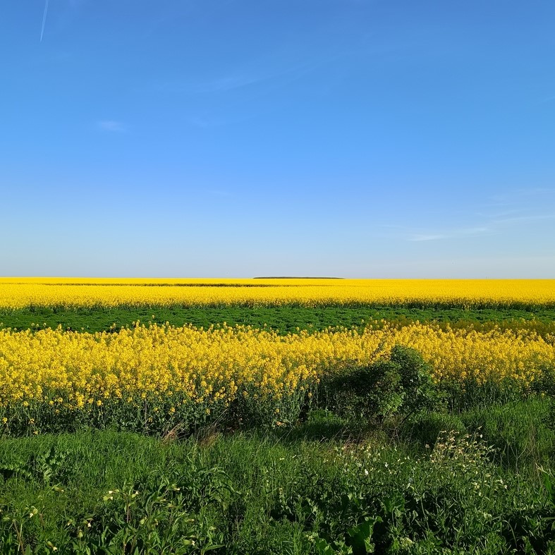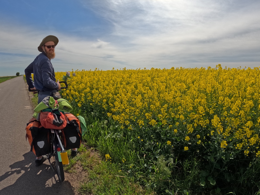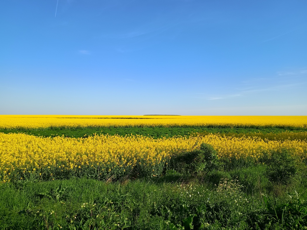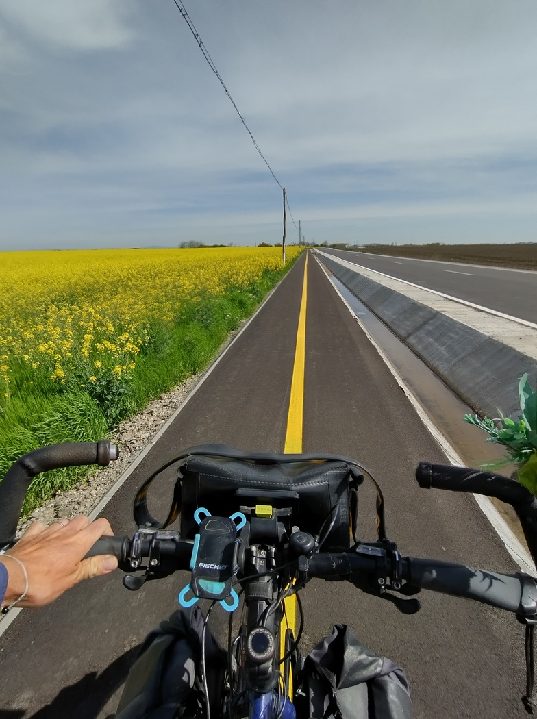 Schließlich ließ er aber doch Stück für Stück nach und wir begannen in das strahlende Gelb der unendlichen Rapsfelder einzutauchen. Diese sollten für die nächsten Tage das Landschaftsbild prägen. Von seinen früheren Besuchen in der Walachei und Moldau hatte Tilmann noch die unendlichen Sonnenblumenfelder in Erinnerung, also hatten diese offenbar zu späteren Jahreszeiten stattgefunden. Angesichts dieser goldgelben Pracht in der das Land also lange Zeiten des Frühjahrs und Sommers erstrahlt, hätte Rumänien sich ohne Rechtfertigungsnot auch die Flagge der Ukraine geben können.
