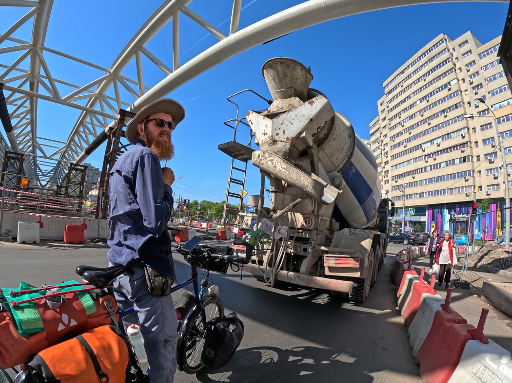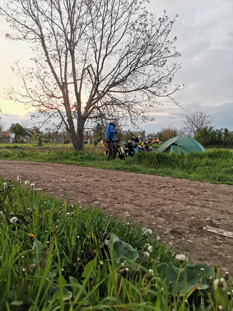 Irgendwann überfuhren wir dann auch noch die 20.000 km Marke und hatten daher bald das Gefühl genug für den Tag geleistet zu haben. Der ungenutzte Teil einer alten Gewerbeanlage lud mit seinen Bäumen und der Wiese versteckt hinter einer Hecke zum Verweilen ein und so war nach 69,7 km Schluss. Da Tilmann die in Bukarest zunächst sinnlos erworbenen Alu-U-Profile immer noch mitführte, diese aber in recht nerviger Weise weit hinten über das Fahrrad hinausragten, war nun Zeit diese einer sinnvollen Nutzung zuzuführen. Julia hatte seit Bratislava und damit seit knapp einem Jahr immer noch keinen nicht irgendwie störenden Ort zur Aufbewahrung ihres Helmes gefunden (was ihren Kopf mit einschloss). So formte Tilmann aus den Profile nun einen Halter für den Helm, den er an Julias Lowrider anbrachte. Es funktionierte ganz hervorragend und ehrlich gesagt ist er fast ein wenig verwundert, dass es bis heute hält und keine Anstalten macht daran zeitnah etwas zu ändern.