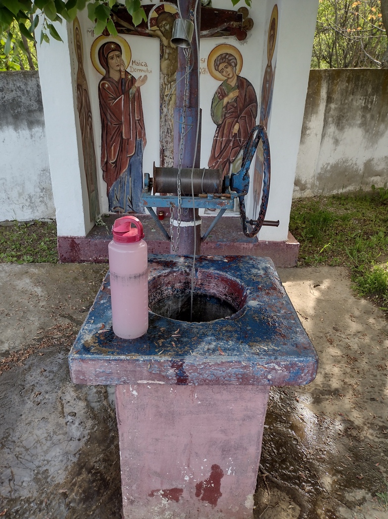 Vor einem Kloster (es gibt in Rumänien nicht nur viele Bestandskloster, es werden auch noch viele neue errichtet, da sich auch junge Menschen, wahrscheinlich aus Perspektivlosigkeit in einem nach wie vor relativ armen Land, in Religion und die ultimative Obhut der Kirche flüchten) wagten wir einen Versucht doch waren enttäuscht, was wir zu Tage förderten. Das Wasser war trüb und wir erkannten bald dass dies nicht etwa von gelöstem Gas herrührte, als wir eindeutig einen Bodensatz Sediment erkennen konnten. Einen Brunnen später, es waren zur Abwechselung mal keine Felder in direkter Nachbarschaft, waren wir mit dem Ergebnis der schweißtreibenden Kurbelei aber dann doch zufrieden und hatten das Wasser beim Umfüllen lediglich mit einem Tuch gefiltert.