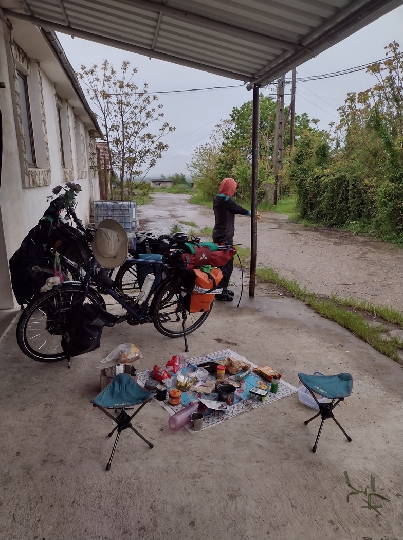 Alles begann aber am Morgen des 4. Mai 2023 als wir uns lange nicht aus dem Zelt bequemen wollten, als wir schließlich das wohlbekannte und abgrundtief verabscheute leise Prasseln auf der Außenhaut unserer Behausung vernehmen konnten. Wir hatten den Moment verpasst das Zelt einzupacken als es noch trocken war und jetzt war es zu spät. Genervt warteten wir eine Regenpause ab, die sich nicht recht einstellen wollte und räumten das Lager schließlich im leichten Nieselregen. Zum Frühstück retteten wir uns unter das Vordach der der nebenan gelegenen Gewerbehalle und konnte unsere Sachen sogar einigermaßen trocknen.