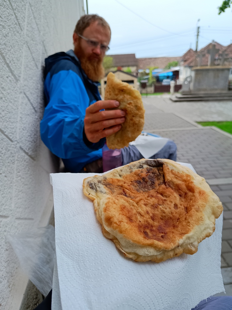 Zwar hellte sich der Himmel etwas auf, doch unsere Laune wollte es ihm nicht so recht gleich tun. Wir lasen gerade den Post von Instagram Post von Lauren & Laurien darüber, dass sie in Rumänien bisher die grandioseste Gastfreundschaft erlebt hatten und ihnen sogar Geld geschenkt wurde. Wir rieben uns ein wenig verwundert die Augen und vermuteten eine regionale Abhängigkeit und, dass das Multikulti in Siebenbürgen eine erhöhte Xenophobie zur Folge gehabt hatte. Doch dann schlug an diesem Tag die rumänische Gastfreundschaft endlich auch bei uns zu und wurde uns zunächst mit der Überreichung zwei köstlicher frischgebackener Pfannkuchen bewiesen, als wir an einer Kirche rasteten. Als wir beim Aufbrechen noch nach Wasser fragten, bekamen wir obendrein noch eine Flasche Tuica geschenkt.
