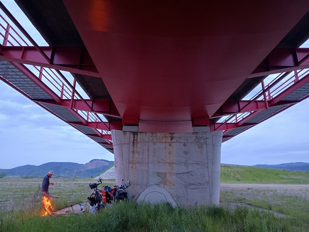 So hatten wir der Sonne genug Zeit gegeben, die Oberhand gegenüber den Regenwolken zu gewinnen und fuhren weiter den Fluss entlang, durch kleine Dörfer ohne viel Verkehr. Doch der Tag sollte nicht so freundlich bleiben und behielt noch einen Anstieg bei Regen auf einer vielbefahrenen Straße bereit, den wir bei einem Besuch in einer Pizzeria verdauen wollten. Auch der Abend blieb ungemütlich und so suchten wir wegen drohendem Regen nach einem schützenden Überdach. Die Wahl fiel schließlich tatsächlich auf unter einer Brücke, die bei unserer Ankunft erstaunlich wenig befahren wirkte. Lediglich mussten wir jede Menge Glasscherben aus dem Weg fegen, aber dafür hatten wir ja seit Saudi-Arabien bzw. schon seit dem Iran einen praktischen Handfeger dabei. So schien der Platz erst ok, erwies sich dann aber als doch besonders schlechte Wahl, denn die bei unserer Ankunft ruhig wirkende Straße war nachts doch von einigen LKWs befahren, die über die Brücke rumpelten. Schließlich setzte auch noch Regen ein und dieser wurde seitlich vom Wind bis unter die Brücke geblasen. Wir hatten aus Platzmangel und in der Erwartung eines übergeordneten Regenschutzes nur das Innenzelt aufgebaut und mussten nun bei Wind, Regen und im Schlafanzug noch irgendwie das Überzelt aufbauen und mit improvisierten Befestigungselementen versehen.