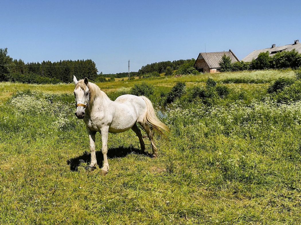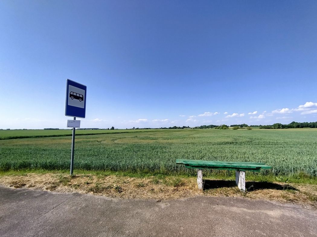 Besonders schöne Landschaften erblickten wir an unserem ersten Tag in Litauen auch nicht, es ging entlang an langweiliger Feldern, manchmal Kiefernwälder und durch nicht besonders ansehnliche Ortschaften. Der Tag zog sich und unser für den Abend anvisiertes Ziel an einem kleinen See stellte sich als das Brutgebiet einer Mücken-Mega-Metropole heraus, weshalb Tilmann schnell floh und Julia über die Nichteignung dieses Spots informierte. Zusammen hielten wir etwas ratlos zwischen den Feldern, dem Friedhof und dem Kirchhof nach einem anderen Platz Ausschau. Genau genommen waren natürlich überall Mücken, doch erstaunlicherweise konnten schon 5 Meter einen großen Unterschied in der Konzentration machen. Um die Platzsuche nicht unnötig auszudehnen, beschlossen wir bei einem kleinen Bauernhof zu fragen, ob wir dort auf der Wiese zelten könnten.