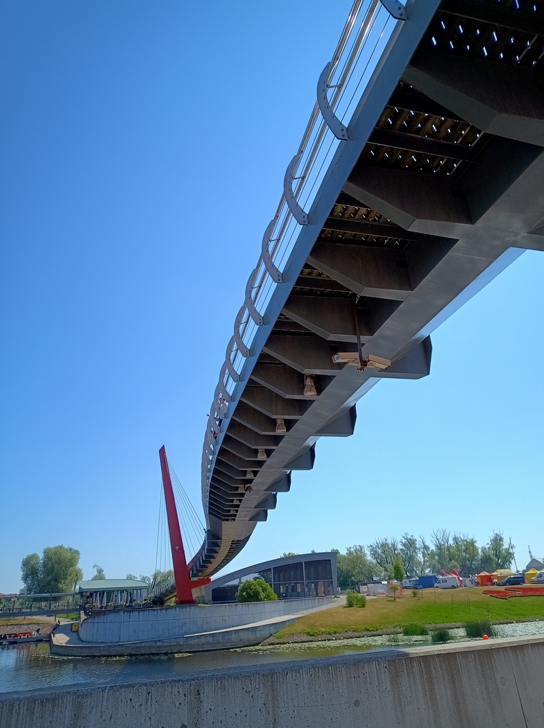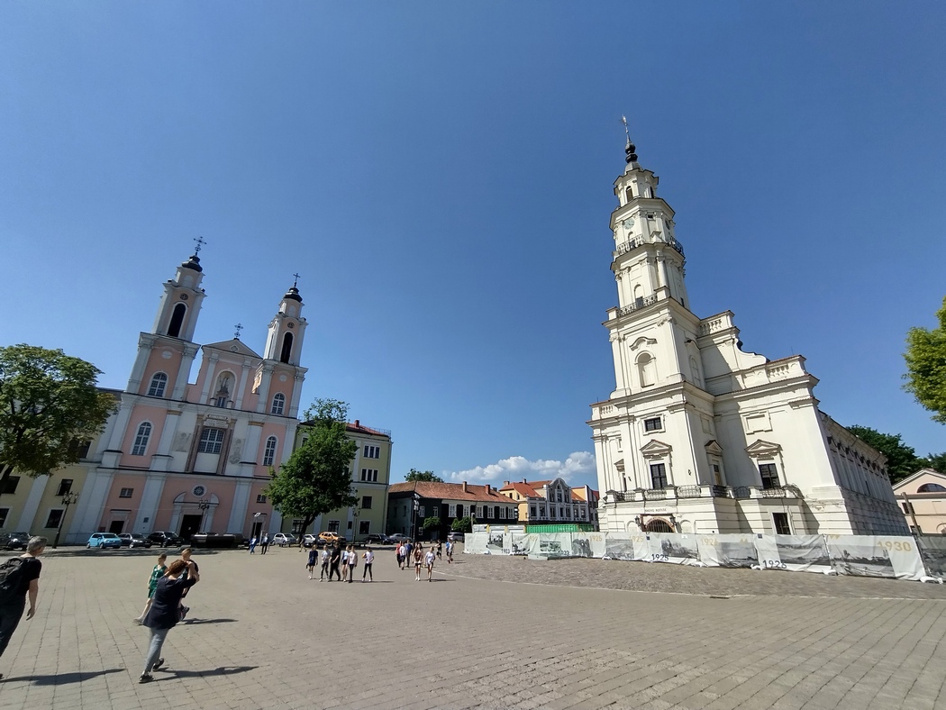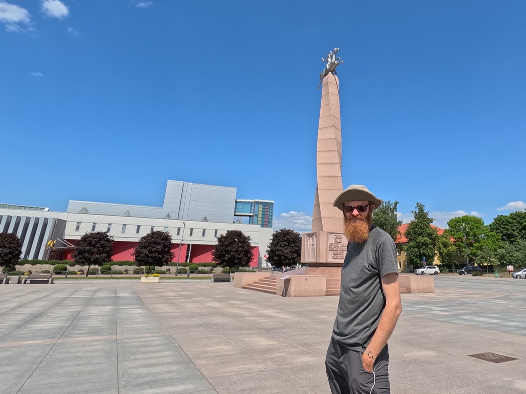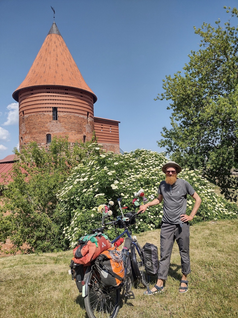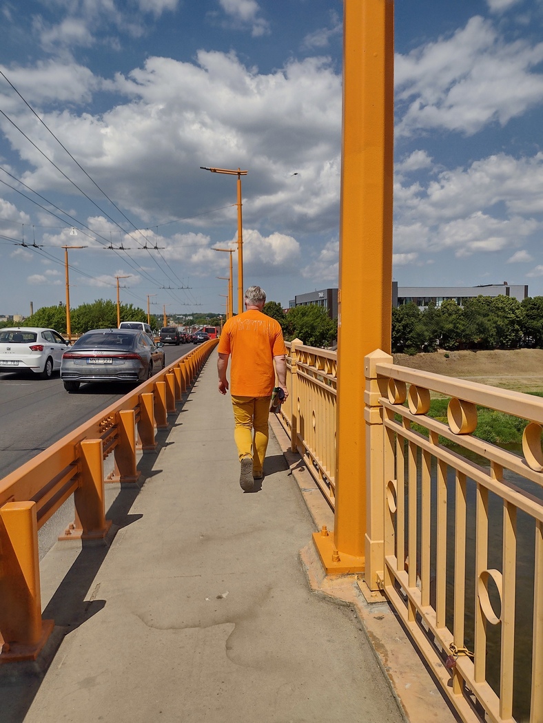 Der Ausflug nach Kaunas hatte sich nicht besonders gelohnt. Sicher, die Altstadt und die St. Peter und St. Paul Kathedrale waren ganz hübsch aber auch nicht weltbewegend. Hinzu kam, dass der Weg in die Stadt ihn endlos in der prallen Sonne an stark befahrenen Hauptstraßen entlang führte und der offizielle Fahrradweg am rechten Ufer der Memel sich bald in eine solcher unkomfortablen Schotterpisten mit Waschbrettmuster verwandelte. Am bemerkenswertesten war somit vielleicht die Begegnung mit einem Österreicher vor der Kathedrale, der unbedingt ein paar Aufnahmen von Tilmann machen wollte. Beim Thema Reisen gab er an, dass er der erste Mensch gewesen sei, der alle Länder der Erde bereist habe. Das eigentliche Highlight in Kaunas ereignete sich allerdings beim überqueren der Neris über die Petras Vileisas Brücke. Diese ist aufgrund ihrer ungewöhnlichen Farbgestaltung mit orangen Pylonen und gelben Geländer schon für sich ein gewisser Hingucker. Nun begab es sich aber zudem, dass die Brücke gerade von einem Fußgänger genutzt wurde, der in oranges Oberkleid und gelber Hose, in der Brückenfärbung exakter Entsprechung, gewandet war. So etwas erlebt man nicht aller Tage.