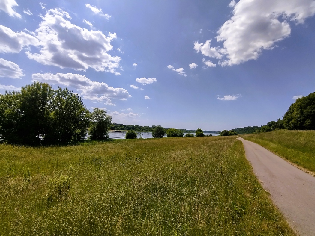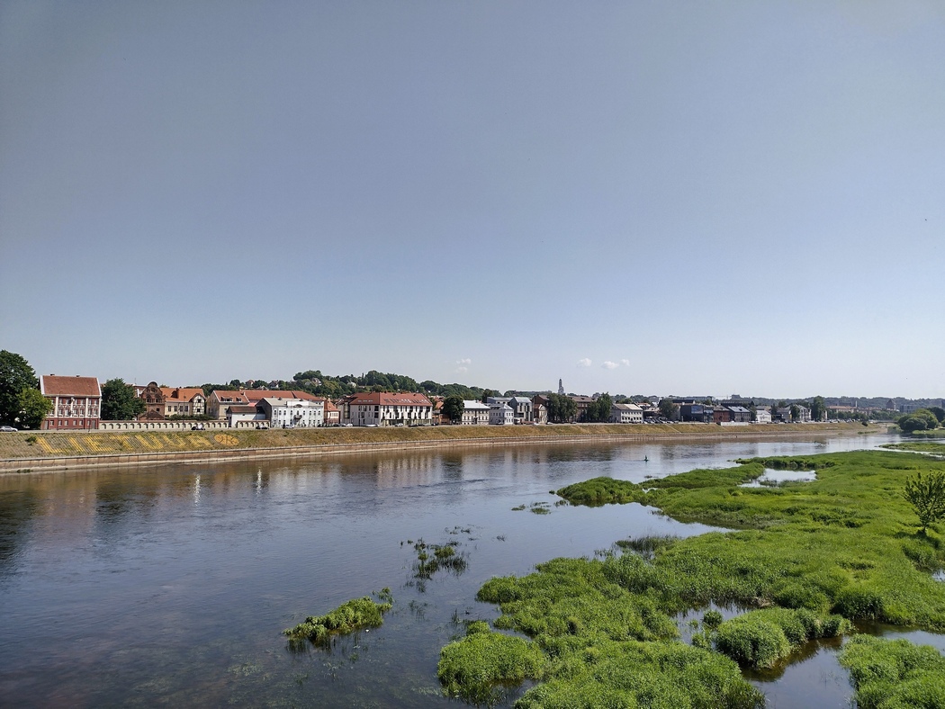Während Julia am nächsten Tag weiter der geplanten Route folgte, unternahm Tilmann noch einen Ausflug nach Kaunas. Rund um die Memel war die Landschaft nun schöner, hügelig und bewaldet, durchsetzt mit kleinen Seen (Mückenalarm!) und führte lange Zeit am Fluss entlang. Der Verkehr wurde etwas weniger, doch die Laster, die Kies umherfuhren, donnerten ohne auch nur einen Zentimeter Abstand zu nehmen an kleinen Fahrradfahrern vorbei, selbst wenn kein Gegenverkehr kam, also genug Platz gewesen wäre, sodass man den Eindruck gewann, hier wolle jemand sein Revier markieren. Julia fuhr am Südufer der Memel entlang und nahm die Fähre bei Vilkija, wofür sie zunächst die beiden bierbäuchigen und oberkörperfreien Fährmänner in ihrem Kabuff wecken musste. Tilmann hingegen blieb, nachdem er Kaunus erkundet hatte, nichts anderes übrig als die dortige Brücke zu nutzen und die Memel am Nordufer zu befahren, da Julia versäumt hatten ihm das Fährgeld in bar auszuhändigen als ob sie nicht wolle, dass er es Charon aushändigt.