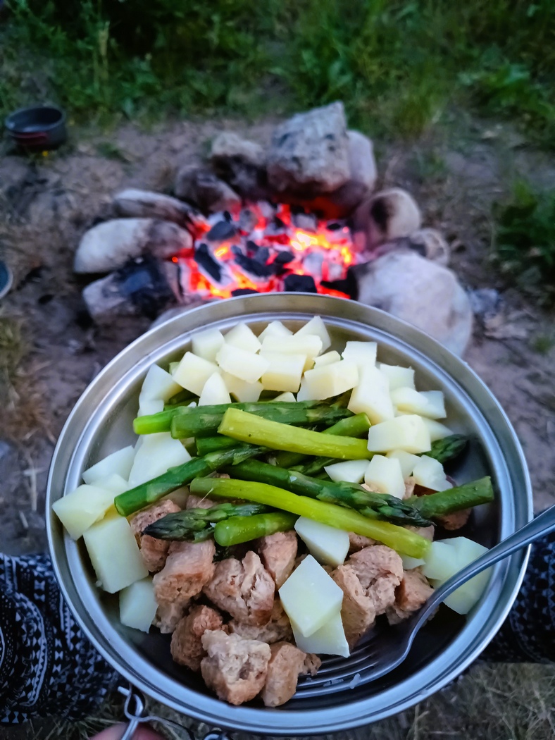 Doch das mit dem Umbau wollte nicht klappen, genauer gesagt, der Umbau klappte, aber die Pumpe funktionierte nicht. Das letzte Mal hatten wir vermutlich in Georgien mit Benzin gekocht, da lief er noch, im Rahmen der oben genannten Einschränkungen, einwandfrei. Die Pumpe musste also in der Tasche schaden genommen haben. Nach langem Versuchen, gab Tilmann auf. Die Kartoffeln lagen schon geschält und geschnitten im Topf und wären roh leider nicht genießbar gewesen. Was für ein Glück, dass just in dieser Situation ein Mann mit Kind und Hund des Weges kam, der Hilfe anbot. Obwohl wir nur missmutig grummelten, dass unser Kocher kaputt sei, wir aber nicht wüssten, wie man uns helfen könne, wollte er nicht aufgeben und bot uns an, uns zumindest etwas Grillkohle zu bringen, damit wir schnell ein Feuer entfachen konnten. Unser Abendessen war gerettet und wir waren sehr dankbar. Es war natürlich trotzdem spät geworden, doch als wir um halb 12 ins Zelt krabbelten, war immer noch ein Lichtstreifen am Himmel. Uns war klar: Richtige Dunkelheit würden wir nun für eine ganze Weile nicht mehr erleben, wir kamen langsam dem Norden näher.