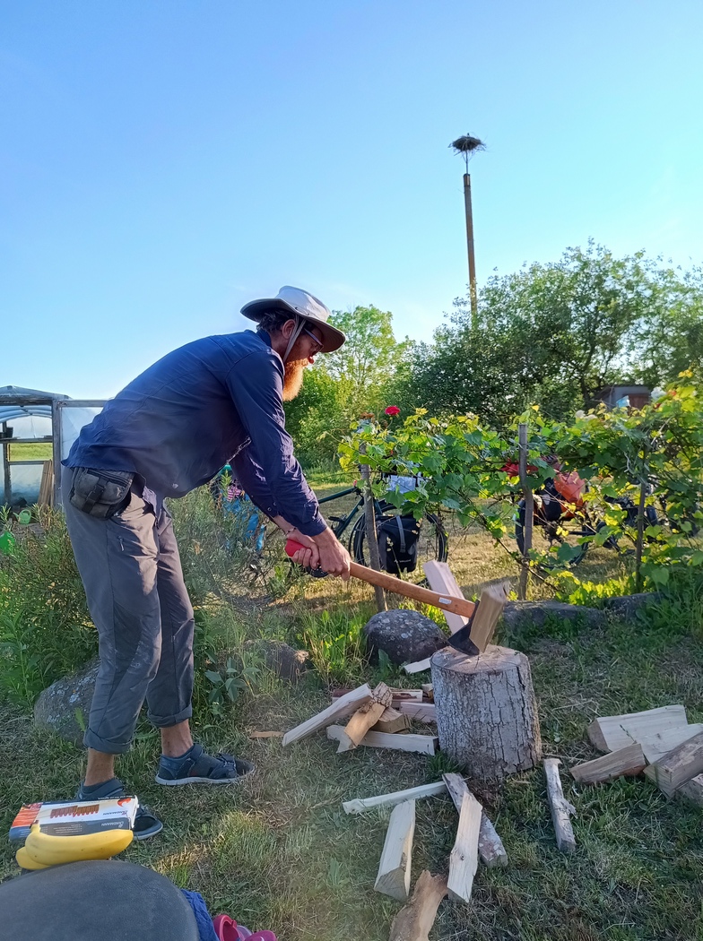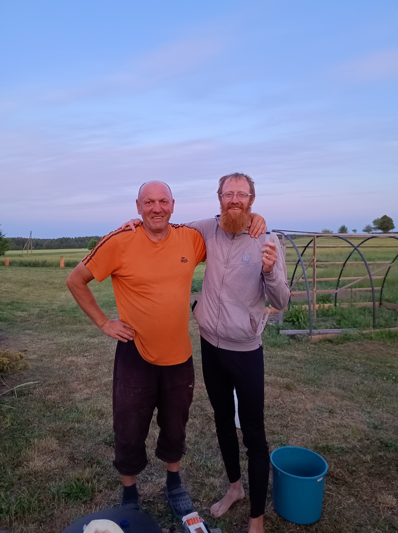 Am Nachbarhaus (in Lettland) fragten wir noch nach Wasser. Der verlottert aussehende junge Mann mit schütterem Haar und aknevernarbten Wangen gab uns gerne Wasser und befragte Tilmann ausgiebig zu seinem Bart. Er ließe seinen ja nun auch seit einigen Jahren wachsen, hätte aber immer noch keine Frau gefunden und wollte deshalb wissen, ob Tilmann bereits den Bart hatte, als wir zusammen kamen. Wir sicherten ihm zu, dass es bestimmt noch klappen würde mit den Frauen (ohne daran wirklich zu glauben) und sagten ihm, dass wir nebenan zelten würden. Er meinte noch, dass sei kein Problem, er könne uns leider nicht zu sich einladen, wegen seines Vaters (den wir nicht zu Gesicht bekamen).