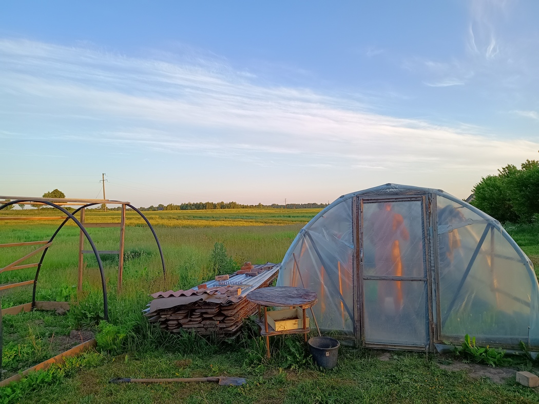 Auch Tag 433 bescherte uns Gegenwind, der Verkehr war zwar nicht sehr stark auf dieser Strecke, dafür holperten wir über zahlreiche Schlaglöcher und durch Spurrillen. So richtig Spaß machte es nicht und wir gaben auf, bevor wir unser angedachtes Ziel erreicht hatten. Zwischen den Feldern und kleinen Dörfer entdeckten wir auch keinen einladenden Schlafplatz, der uns etwas Windschutz geboten hätte und beschlossen bei Leuten zu fragen, ob wir nicht in einem der hübschen Obstgärten ein Plätzchen einnehmen könnten. Wir bogen also in einen kleinen Seitenweg ein, entdeckten einen hübschen Garten neben einem gepflegten Haus, jedoch keine Menschen. Während wir diskutieren, kam hinter einem Nachbargebäude, dass eher wie eine Scheune aussah, ein glatzköpfiger Mann hervor und schien ganz begeistert, ob unseres Auftauchens. Sogleich bot er uns seinen Garten an, die Scheune war tatsächlich sein Wohnhaus. Der Garten dazu war hübsch angelegt und bot um eine Feuerstelle herum auch einige Sitzplätze. Wir fanden einen etwas windgeschützten Platz und während er und seine Frau (die nur einen Bademantel trug und kaum noch Zähne hatte, obwohl die beiden wahrscheinlich erst Mitte 50 waren) die Nachbarn besuchten, wuschen wir uns in seinem Gewächshaus, in dem es angenehm warm war.