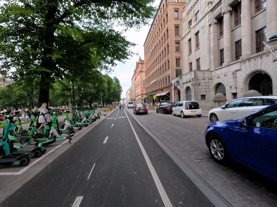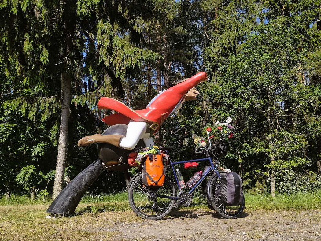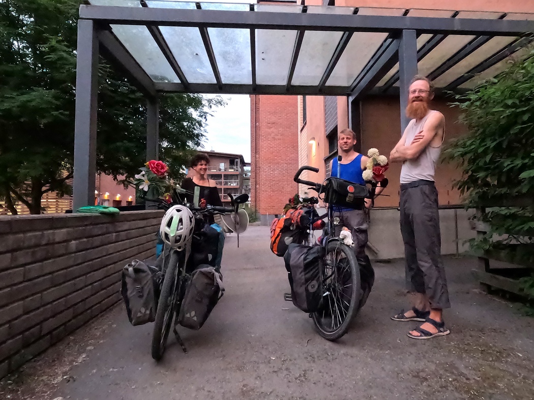 Sven war vor einem Monat bei Freiburg aufgebrochen und hatten noch keinen einzigen Ruhetag eingelegt. Seit seiner Abfahrt hatte er permanent gegen Nordwind gekämpft und dennoch im Schnitt 100 km am Tag gemacht. Entsprechend zermürbt war er, obwohl er eigentlich ebenfalls noch ans Nordkapp wollte. Als B ihm offenbarte, dass es von Helsinki aus noch immer mehr als 1.500 km seien, winkte er ab. Das sei ohnehin das letzte Mal, dass er eine solche Tour mache. Während dieser Unterhaltung rauschten in beide Richtungen andere Radreisende an uns vorbei. Wir waren wieder in fahrradaffinen Gefilden unterwegs.