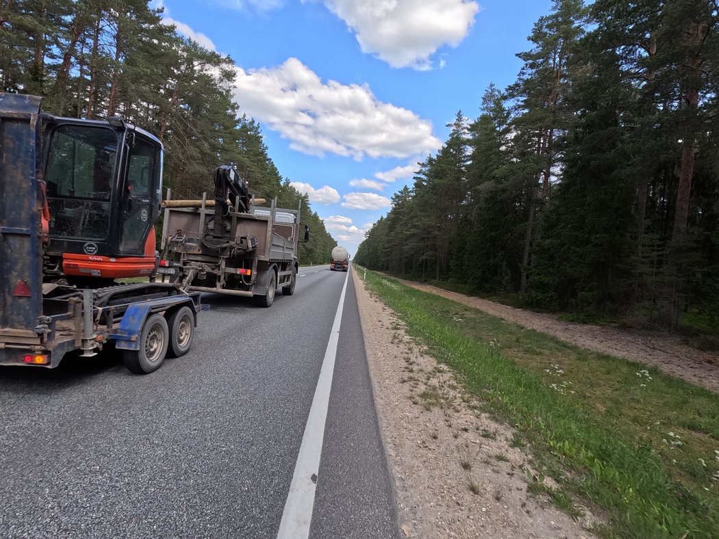 B folgte weiter dem Verlauf des EV13 in Richtung der estnischen Grenze. Die Erfahrung dieser Route blieb weiterhin unschön und so wurde ein weiterer, letzter Versuch gewagt, dem öden Highway zu entrinnen, aber in Liepupe steckte der Vorderreifen des Patria schon wieder im losen Schotter fest und so sollte es der letzte Versuch bleiben. Die Straße war in allen Online-Karten mit gelber Farbe als Hauptstraße kenntlich gemacht!