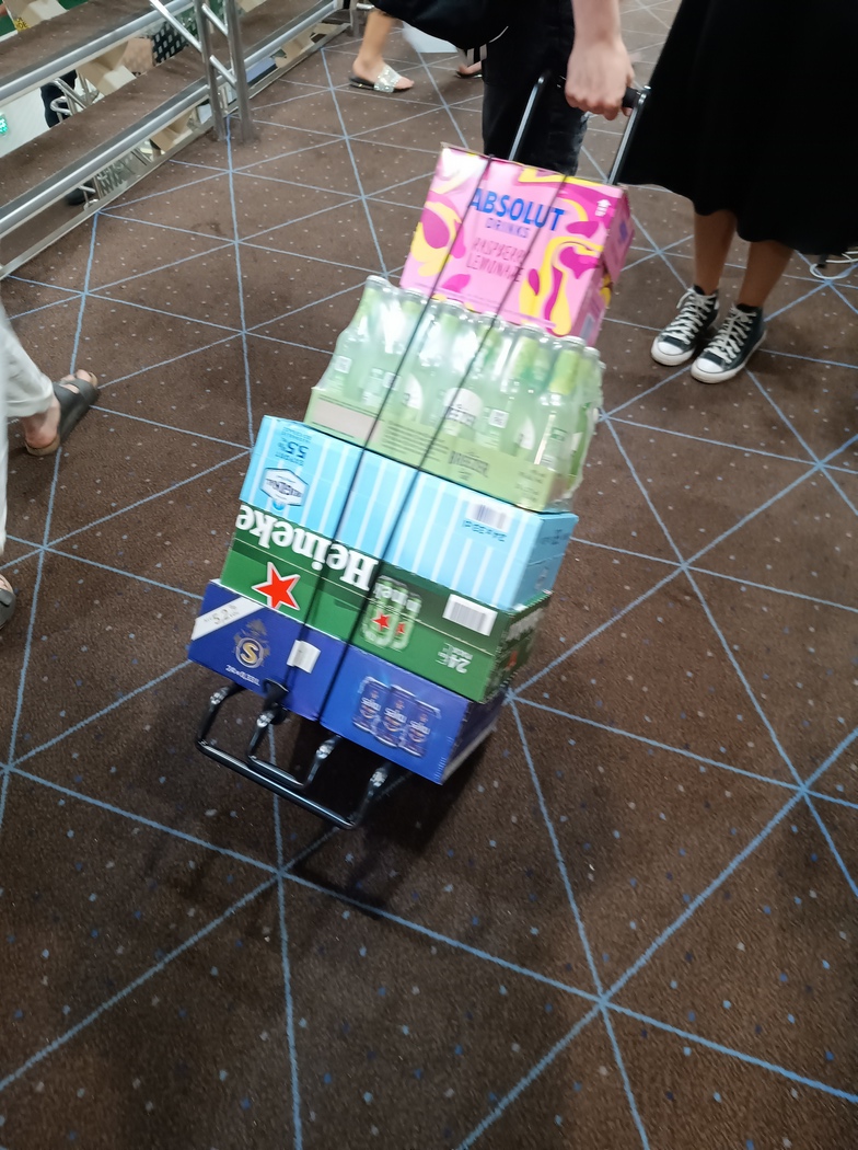 So begaben wir uns zu den Sitzplätzen auf der Fähre, die nur in Bars mit fürchterlicher und fürchterlich lauter Musik vorhanden waren (zuvor hatten wir noch die Darbietung eines Zauberers ertragen müssen). Die anderen Passagiere, hauptsächlich alkoholisierte Finnen, zogen Hackenporschen hinter sich her, auf denen Bierkartons ins praktischer Hackenporsche-Fähre-Verpackung gestapelt waren. Offensichtlich führte die hohe Alkoholsteuer in Finnland dazu, dass Alkoholhersteller in Estland eben dieses Verpackungsformat für ihre finnischen Kunden entwickelt haben.