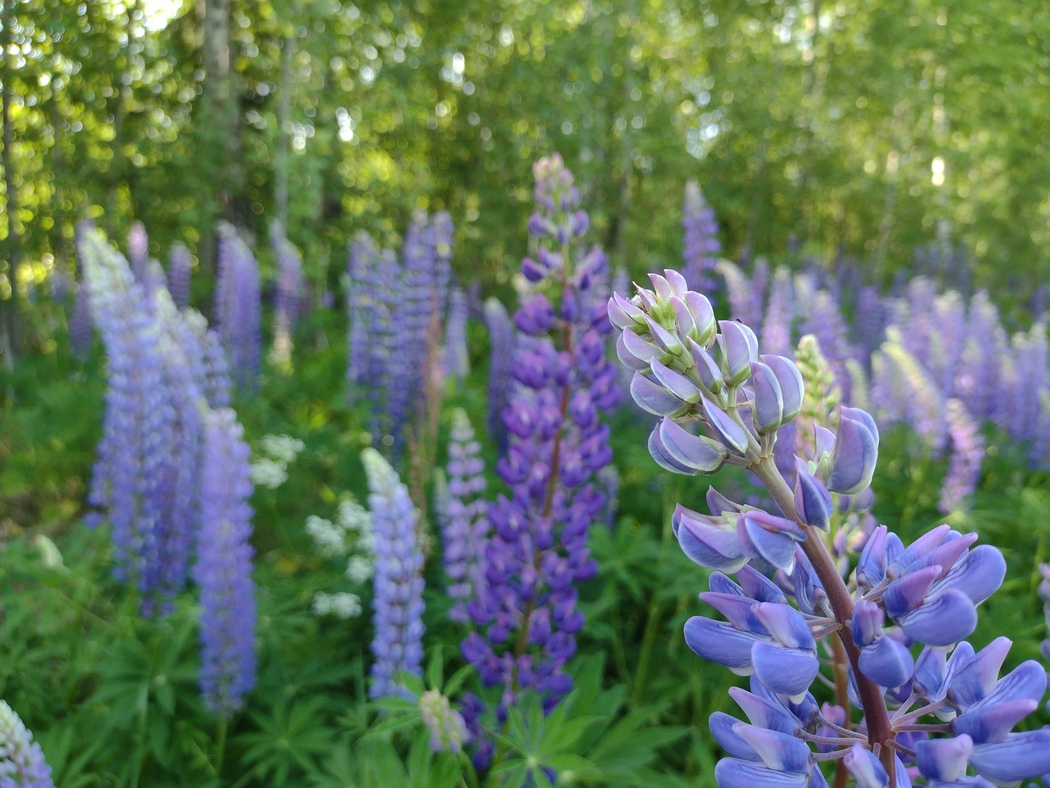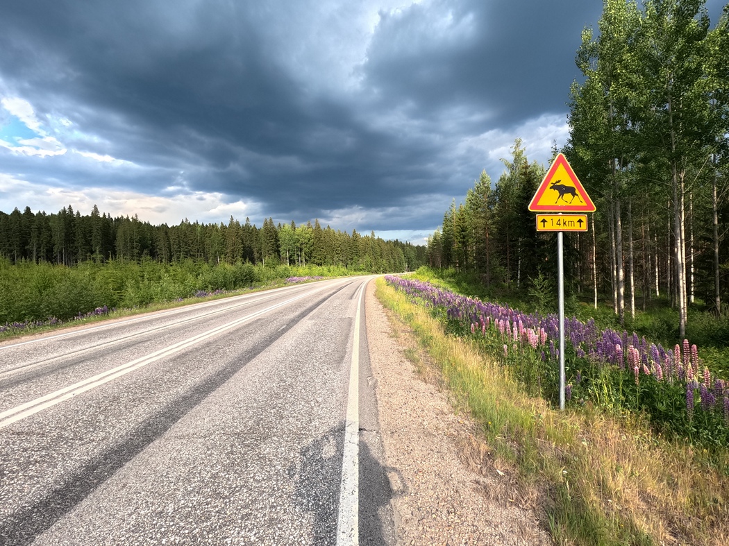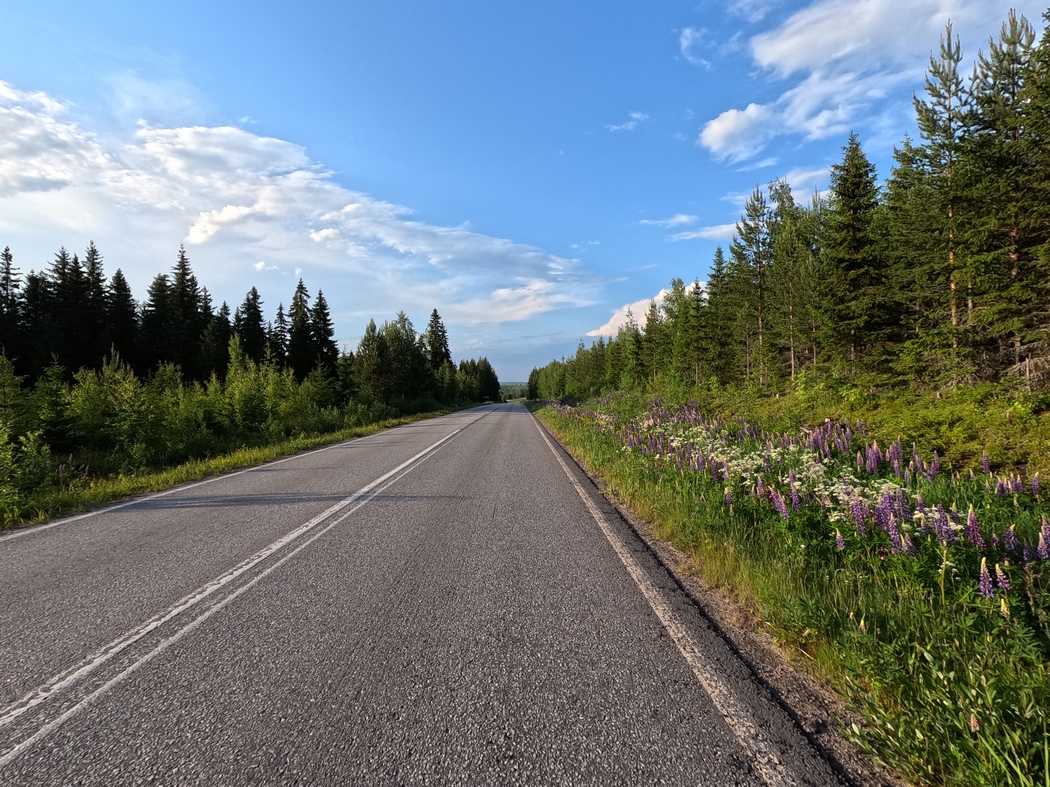 Dass die Landschaft dennoch relativ eintönig ist, trifft hingegen zu. Tilmann fuhr, während es bis 12 noch ein wenig dämmeriger wurde und danach schon wieder heller, durch endlose Fichtenwälder, durch deren Geäst hin und wieder mal ein See schimmerte. Auch monoton aber hübsch anzuschauen: Die endlosen pink-lils Lupinien am Straßenrand. Leider eine invasive Neophyte. Am meisten Abwechslung boten da tatsächlich die Steigungen, die einige Male tatsächlich bis zu 10% betrugen. Diese waren jedoch immer kurz genug, um nicht ernsthaft ins Schwitzen zu kommen.