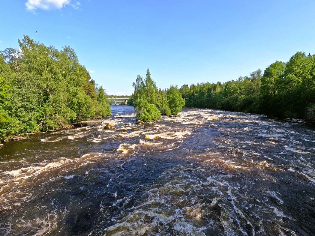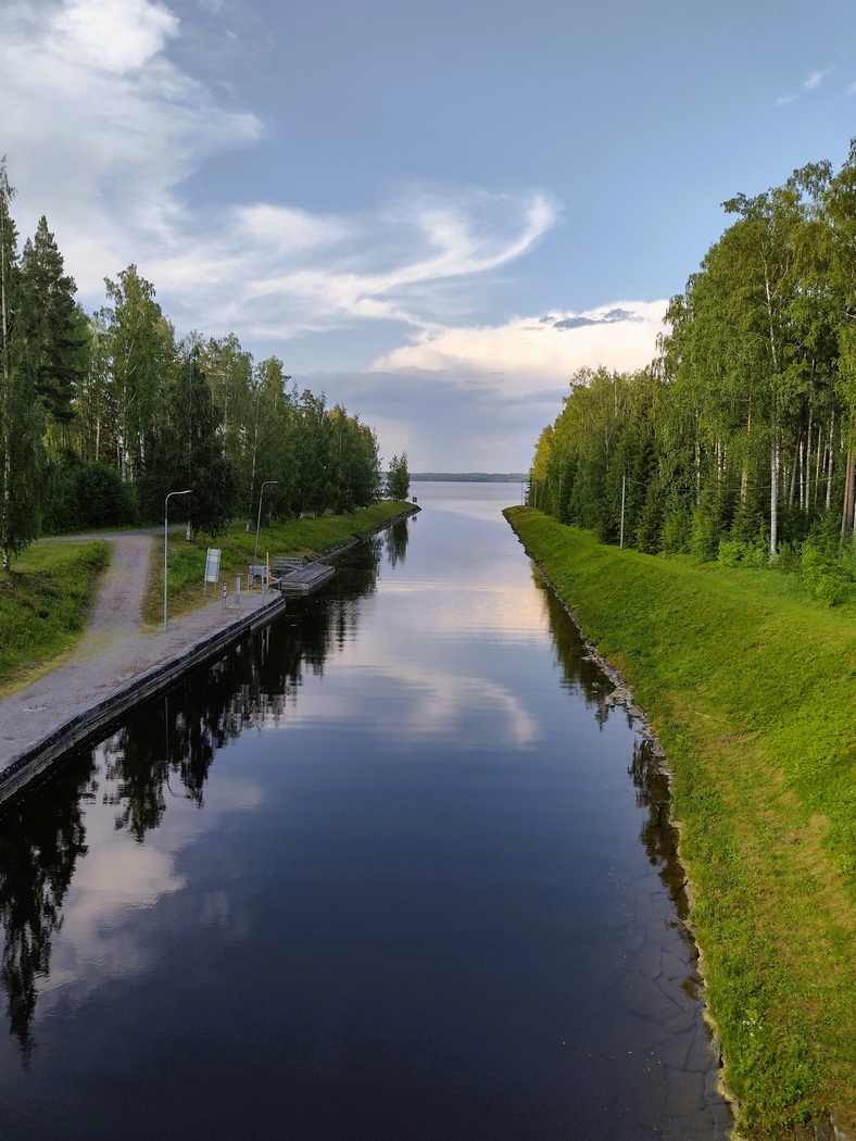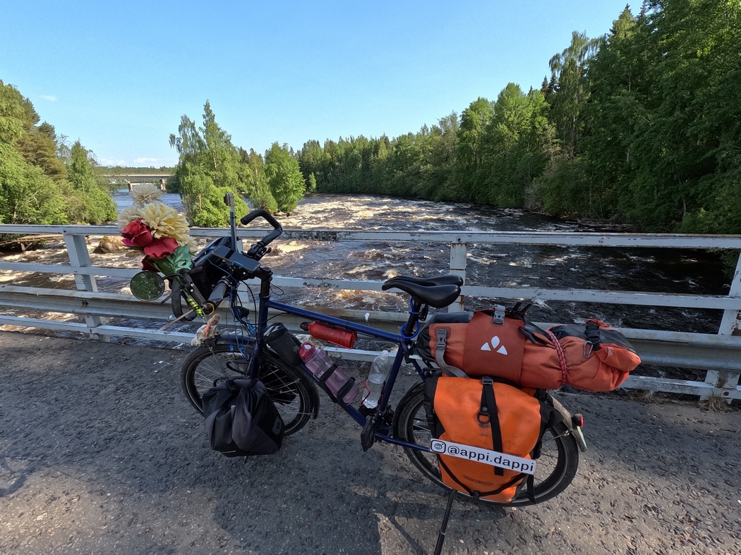 Nach ca. 320 km, es war natürlich längst wieder so warm, dass die etwas alberne Kostümierung hatte abgestreift werden können bzw. hatte es nach dem Bad die Möglichkeit gegeben die Radler(unter)hose unter die Hose zu ziehen, erreichte Tilmann einen mächtigen Strom, der allerdings nur fast so lang wie breit war, wo nämlich das torfig-bräunliche Wasser des Vatianjärvi-Sees in den Saaravesi fließt.