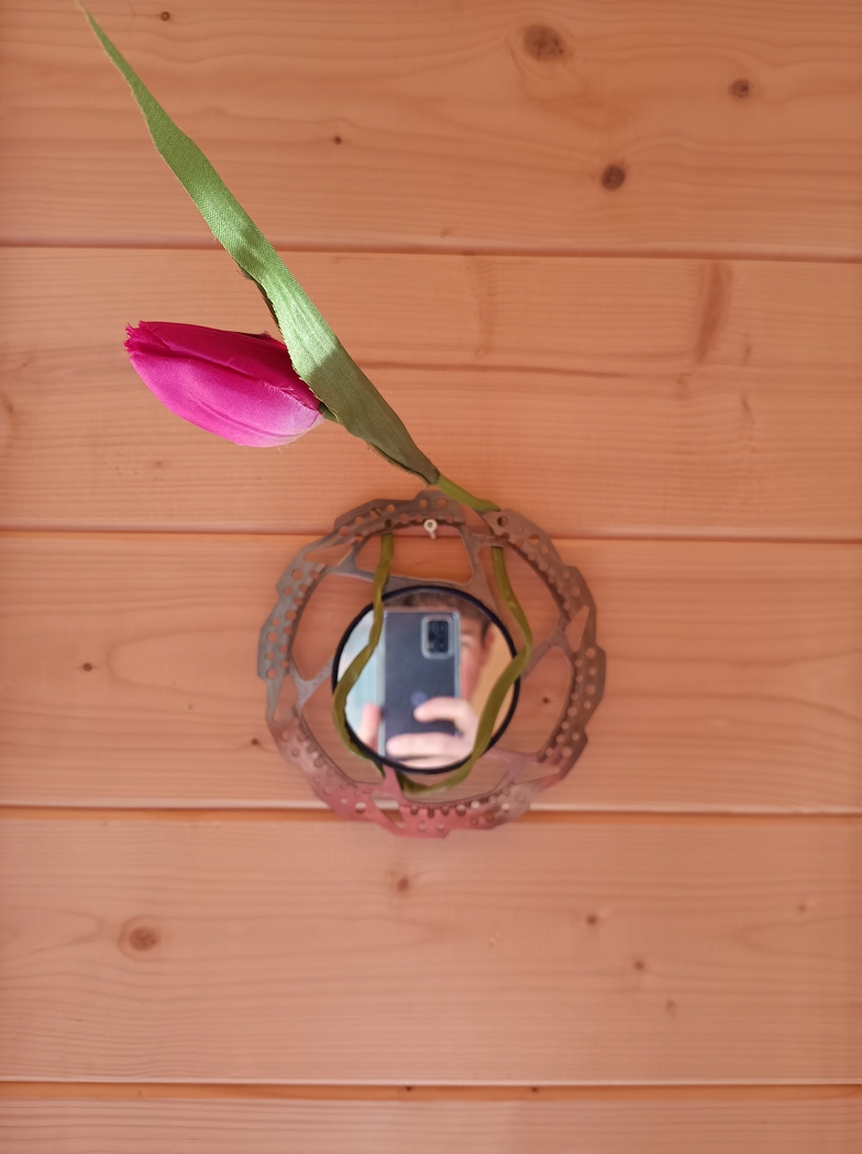 Karl, der sich in den ersten drei Tagen noch dem Home-Office widmen musste, freute sich über unsere Grüße aus der Küche und wir uns über seinen Spaß daran, gemeinsam mit uns albernen kleinen Video-Projekten nachzugehen. In aller Ruhe konnten wir uns nebenbei noch der Fahrradpflege widmen und Tilmann wechselte gleich auch Bremsscheibe und Beläge. Aus der alten Bremsscheibe und einem untauglichen Rückspiegel den er für 2 Euro (komisch, dass der so wackelte) in Lettland gekauft hatte, bastelten wir einen Spiegel für die Gästehütte in der wir untergebracht waren. Wir nutzen zudem die Gunst der Stunde und sortierten noch einmal ein paar Dinge aus, die wir nicht mehr unbedingt zu brauchen meinten und die Karl dankenswerterweise bei seinem nächsten Deutschlandaufenthalt mitbringen wird. Darunter waren unsere eigentlich so lieb gewonnenen Klapphocker und das ungarisch/slowakische Bibelmanifest.