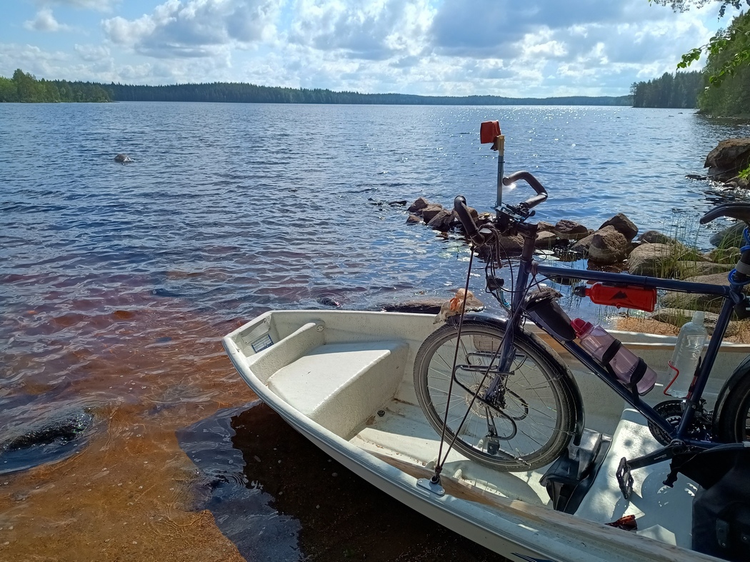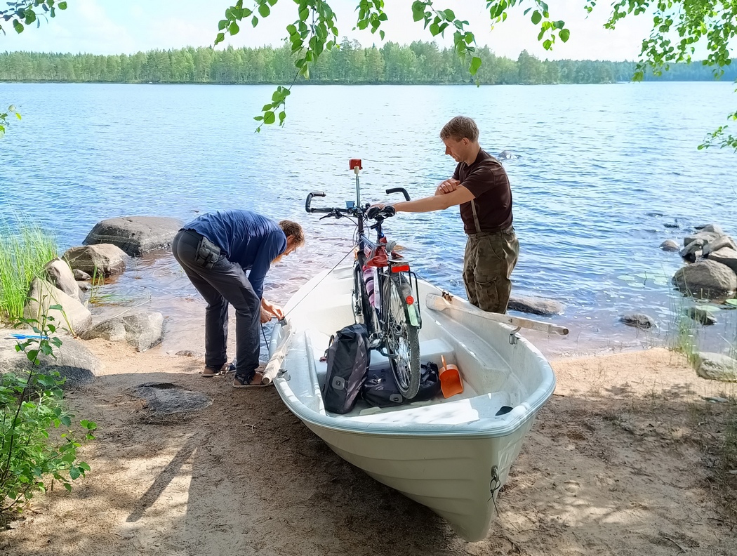 Der Tag des Abschieds war gekommen. Karl hatte die geniale Idee Tilmann tatsächlich, so wie in Kristinas Hypnose-Nummer simuliert, über den See überzusetzen, damit Tilmann relativ schnell den nächsten Supermarkt in Keitele erreichen konnte. Denn ein Start auf der Westseite des Sees hätte dazu geführt, dass der nächste Supermarkt erst im 100 km entfernten Pihtipudas zu erreichen gewesen wäre. Tilmann hatte dies für eine Schnapsidee gehalten, da das Fahrrad sicher nicht in das kleine Ruder-Boot passen würde und sowieso weil Karl zwar kreativ ist, dennoch nicht jede seiner Idee ein Volltreffer. Doch beides sollte sich als Fehleinschätzung herausstellen und Karl Recht behalten.