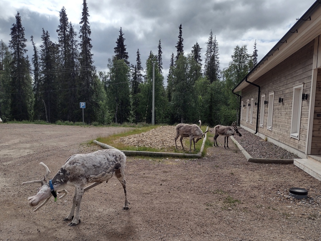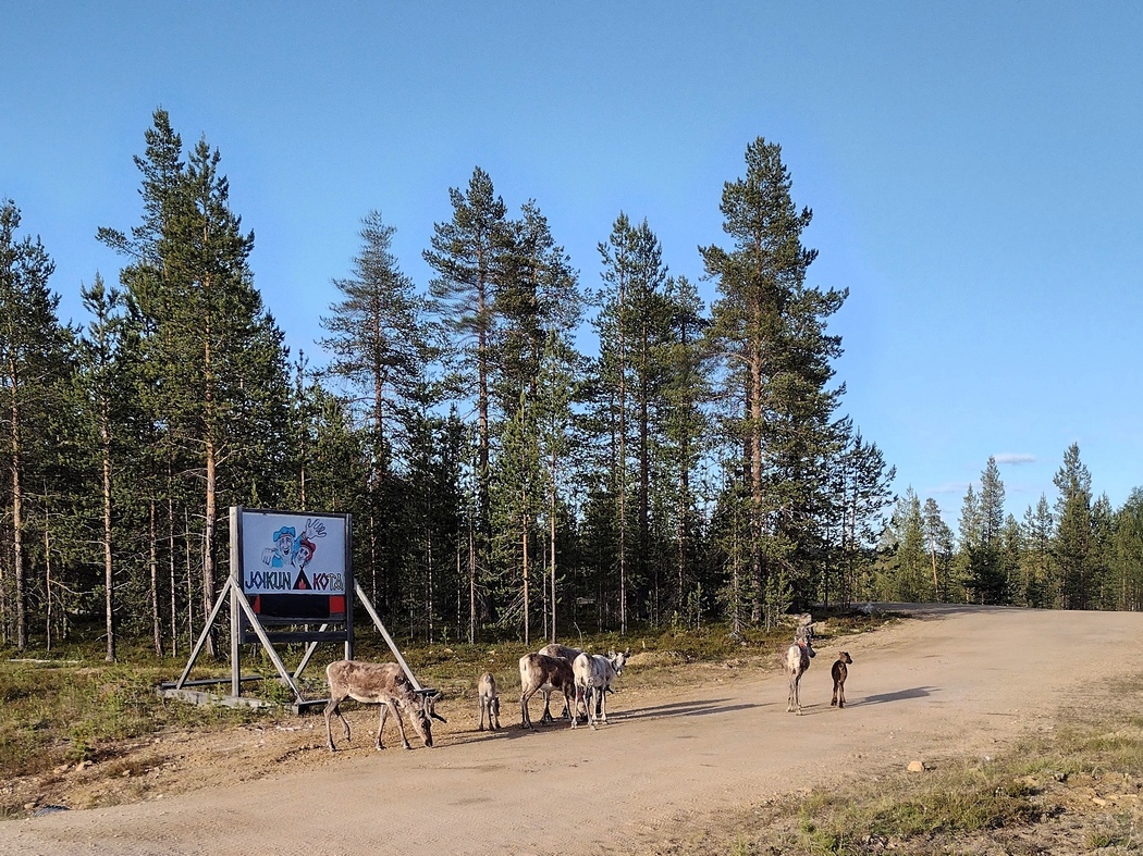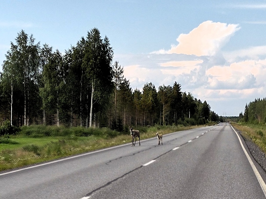 So ganz furchtbar viel bekam er aber zum Glück nicht ab und schließlich war der Regen vorbei und ein Schild, dass Nordfinnland als Rentierzuchtgebiet auswies erschien am Straßenrand. Und tatsächlich stand nur einen Kilometer weiter ein Rentier mit seinem Jungen auf der Straße. Es sollte nicht die letzte Begegnung dieser Art bleiben und bald war klar, dass Rentiere für Nordskandinavien das sind, was Kamele für den Orient sind.