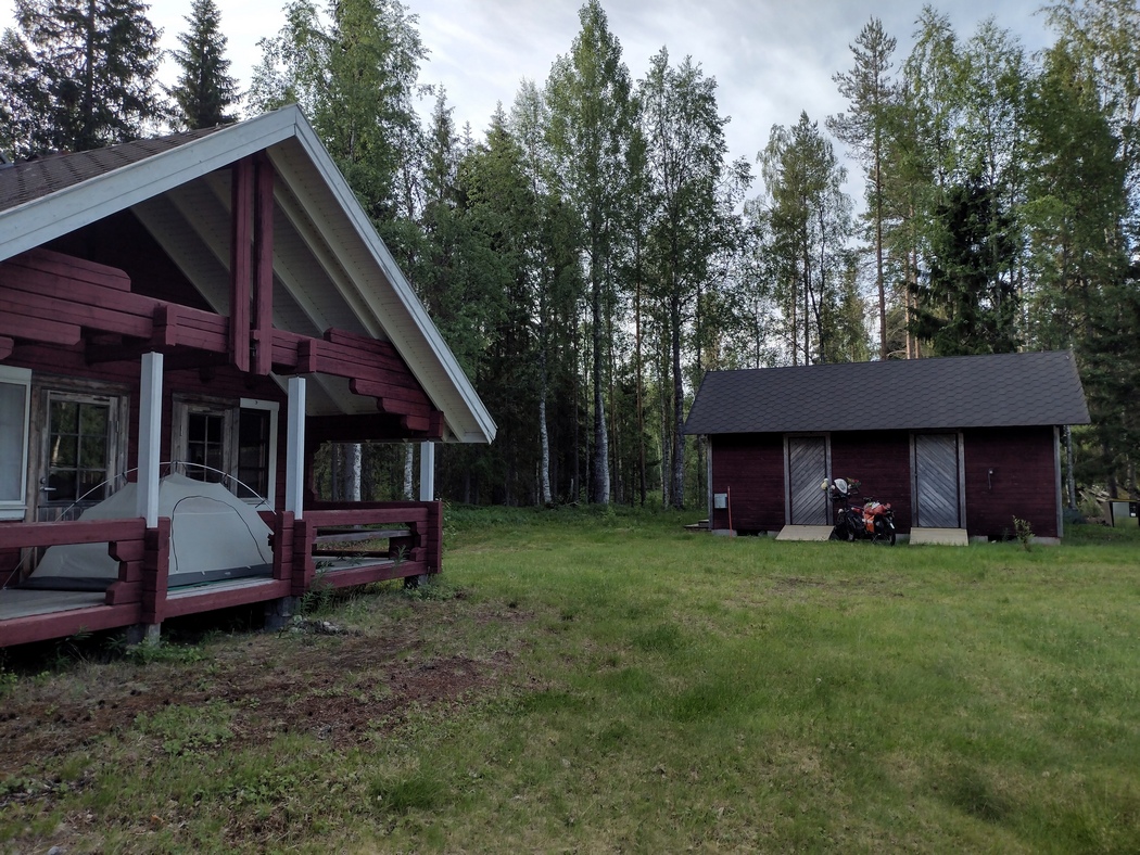 Wenig später, es war sicher schon 10 Uhr, entdeckte Tilmann eine momentan unbesuchte Hütte, die ein Stück abseits der Straße an einem Fluss lag. Da der Schuppen offen stand, entschied sich Tilmann nicht das Zelt aufzubauen, sondern es sich in eben jenem bequem zu machen. Ein Fehler! Denn nach und nach drangen immer mehr Moskitos durch Ritzen und Spalten ein und als Tilmann infolge dessen bis 1 Uhr keinen rechten Schlaf gefunden hatte, stand er wieder auf und baute auf der Veranda nun doch das Zelt auf, da die Wiese inzwischen schon reichlich feucht vom Tau war. Daher ging es wiederum nur mit dem Innenzelt, was nicht wirklich optimal war. Denn da er bereits ein Stück weiter nördlich war, war es auch schon wieder ein Stück heller, was nach der Aufregung der Tiefe des Schlafs nicht wirklich zuträglich war.