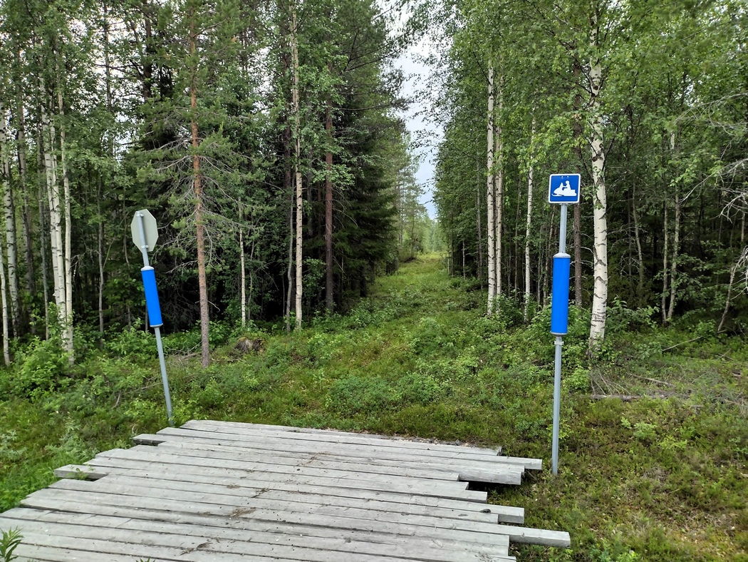 „Wie spät ist es? Ach egal, ist ja eh die ganze Zeit hell. Wo bin ich? Ach egal, sieht ja eh überall gleich aus! Und weit ist es ja sowieso immer noch bis zum Nordkapp.“ Weiter und weiter immer gen Norden war die Devise. Die Landschaft änderte sich kaum, dafür tauchte versteckt hinter einem Restaurant Parkplatz nach einer halben Tagesetappe zumindest mal eine Bank mit Tisch auf. Lange Verweilen wollte man jedoch nicht, denn von Süden rollte ein Gewitter heran. Dafür kam aus Norden ein kräftiger Gegenwind entgegen. Es gelang Tilmann dennoch dem Gewitter unbeschadet zu entkommen. Während des nahezu pausenlosen Strampelns, hatte er sich auch endlich erschlossen, was es mit den roten Plastikrohren auf sich hatte, die links und rechts der Straße senkrecht aus dem Boden wuchsen. Ihre anfängliche relative Seltenheit hatte ihn vor ein paar Tagen noch glauben lassen, es könnte sich um Kabelkanäle handeln. Natürlich handelt es sich in Wahrheit um Markierungen für den schneereichen Winter, und die teilweise Recht großen Abstände zwischen ihnen rühren lediglich daher, dass sie ständig abbrechen und ihre Überreste sich wohl Stück für Stück im Mikroplastikkreislauf einfinden. Alles andere also, als eine nachhaltige Art der Fahrbahnmarkierung, die dennoch leider in ganz Skandinavien verbreitet ist. Ein Schmunzeln vermögen hingehen die Schneemobilweg-Schilder zu erzeugen, wenn man sich bei 27°C und strahlender Sonne durch die immergrünen Wälder bewegt.