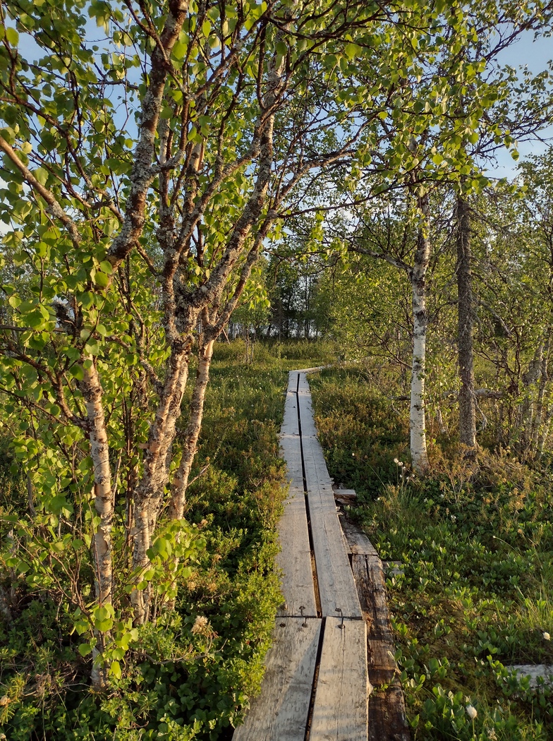 Über derlei Dinge nachgrübelnd war der 453. Tag der Reise schon längst zur Nacht geworden, wovon aufgrund des Sonnenstandes freilich nicht viel zu merken war, als ein Schild den Weg zu einem Aussichtsturm in einem Naturschutzgebiet im Moor wies. Vielleicht konnte man ja dort auch zelten. Konnte man nicht und das Fahrrad hätte man ohnehin kaum über die morschen Planken des 500 m langen Zugangs durch das Moor wuchten können. Der kurze Spaziergang hatte sich aufgrund des Abwechslung bietenden Landschaftserlebnis dennoch gelohnt.