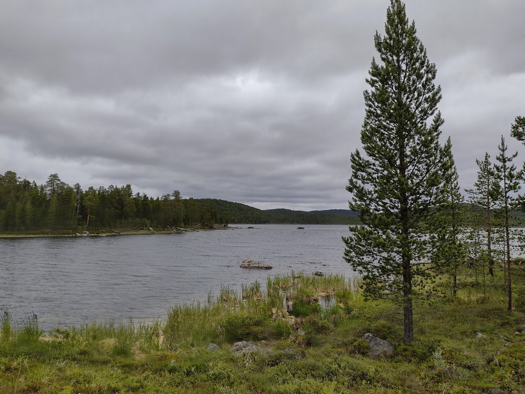 Es war inzwischen kalt geworden, Regenwolken hatten sich zusammen gebraut und der Gegenwind hatte noch einmal an Intensität zugelegt. Abwechselndes Windschattenfahren hätte also durchaus Sinn ergeben. Schließlich setzen auch erste Regenschauer ein, die gelegentliche kurze Stopps erforderlich machten, allerdings gab es auch nicht wirklich etwas zum Unterstellen. Immerhin war die Landschaft kurzzeitig mal wieder etwas interessanter geworden, wo sich der riesige Inari-See mit allerlei Inselchen und aus ihm ragenden Granitfelsen schmückte.