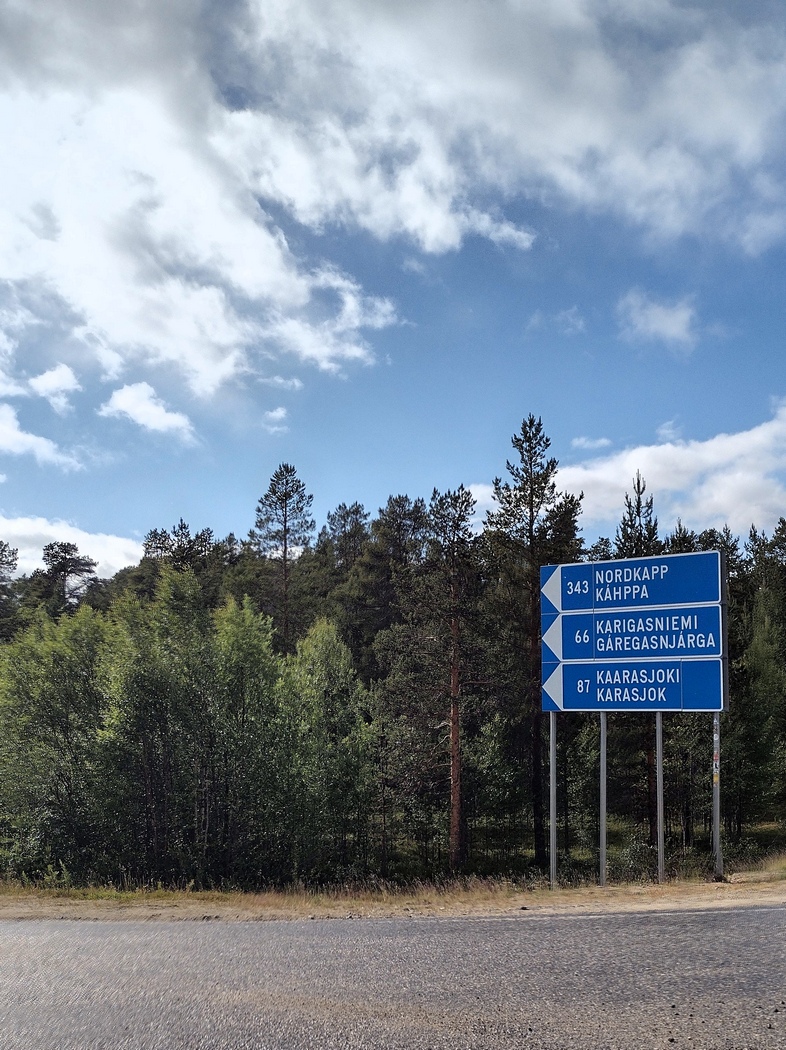 Dort, wo man die E75 schließlich nach Westen verlassen muss, steht auch das erste Hinweisschild zum Nordkapp (343 km), und justament klärte der Himmel unvermittelt wieder auf. Ein gutes Omen? Es blieb jedenfalls nicht lange dabei und bald tröpfelte und windete es wieder vor sich hin. Dafür wurde es auf dem Weg zur norwegischen Grenze nun reichlich hügelig.