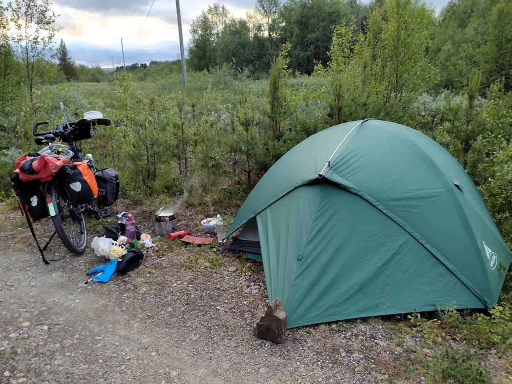 Daher entschied sich Tilmann doch noch einmal weiter zu ziehen und ggf. einfach noch einmal die Nacht durchzufahren. Nach wenigen Kilometern stellte er jedoch fest, dass dies auch keine Option sein konnte und bog in einen Waldweg ab, der zu einem Wanderparkplatz wies. Vielleicht gab es dort ja eine geeignete Hütte als Shelter. So weit musste er dann aber gar nicht mehr fahren, denn bald erschien rechter Hand eine Art Parkplatz, vermutlich für einen Forstarbeitsgerät, der jedoch verlassen da lag. Mücken gab es hier zwar auch, aber unser treues Zelt Edwin ist ja zum Glück schnell errichtet. Die relative Ruhe hier ließ wenigstens noch ein bisschen Schlaf zu.