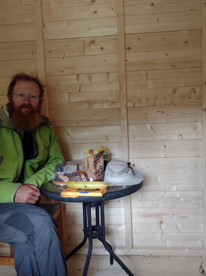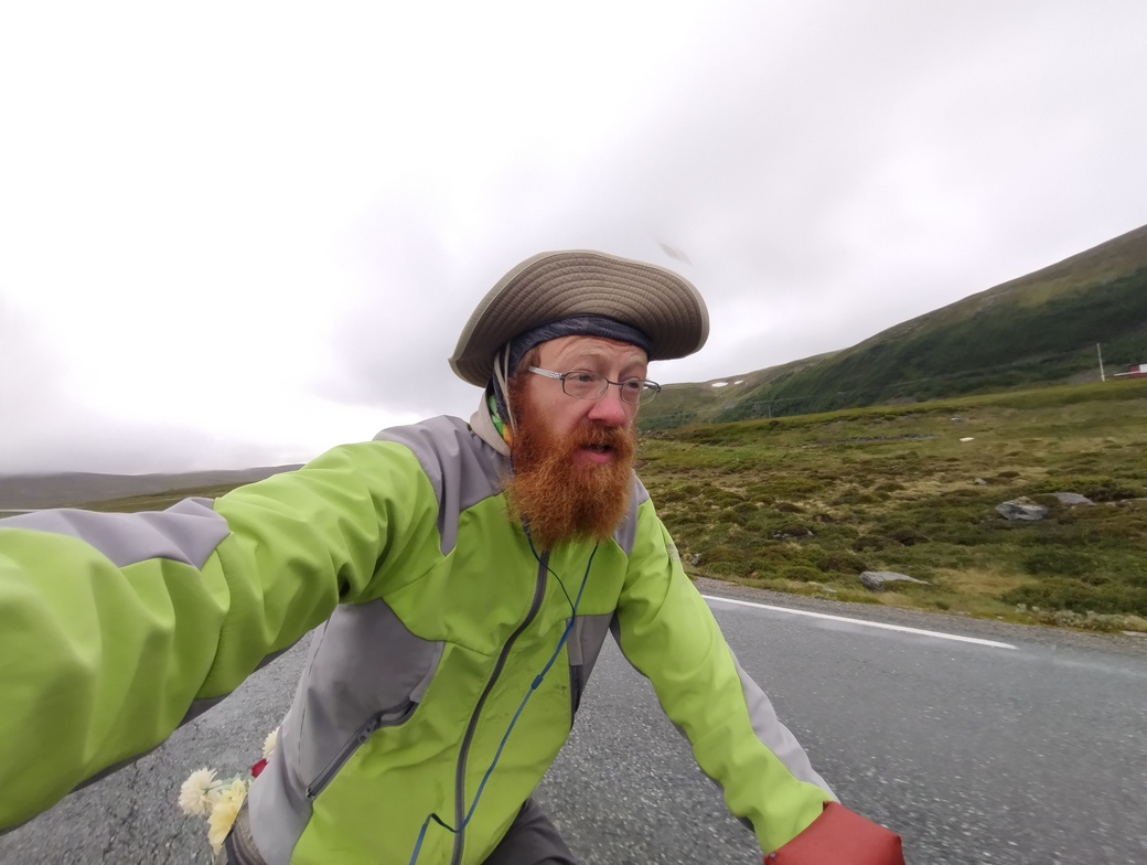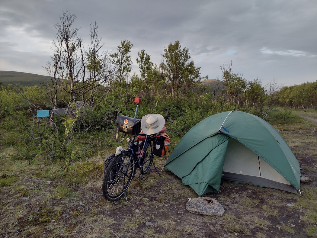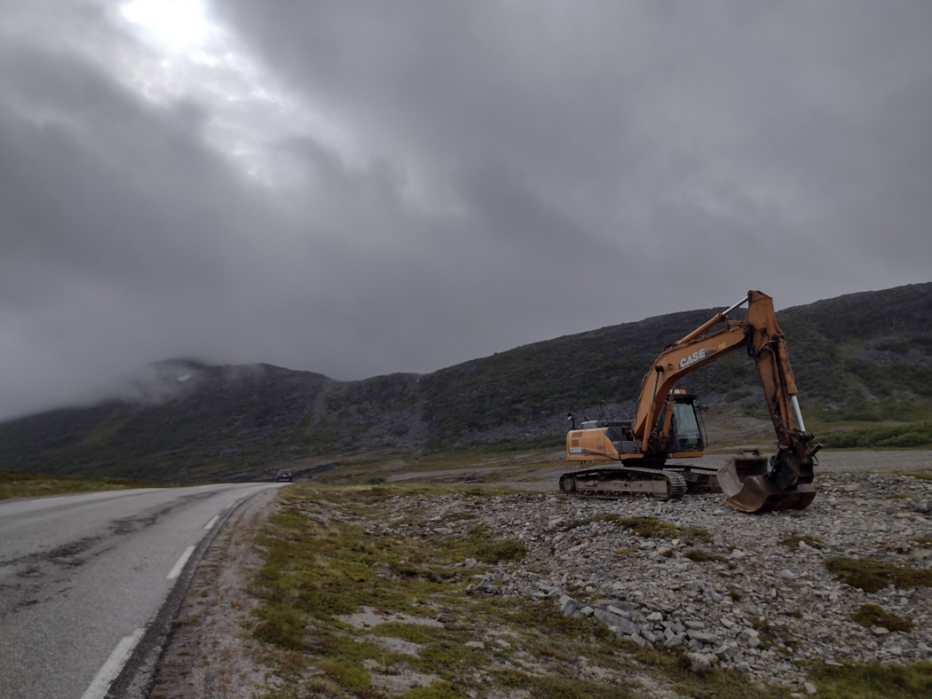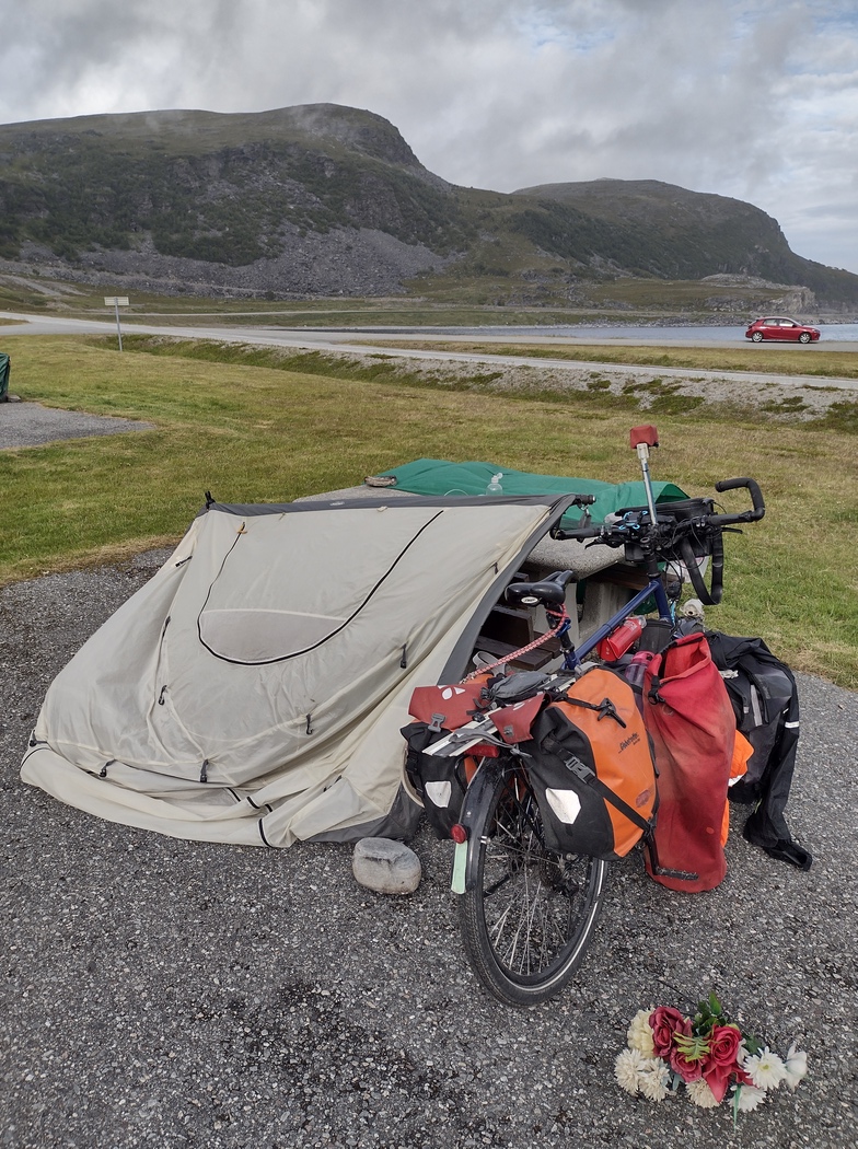 Das Wetter war noch ein bisschen schlechter als am Vortag, aber, gefühlt zum ersten mal seit Eilat, hatte ich immer wieder kräftigen Rückenwind und kam daher in rasantem Tempo vorwärts. Bald hatte ich Honningsvåg erreicht, dann den Honningsvåg-Tunnel hinter mir gelassen und auch der Nordkapp-Tunnel hatte beim zweiten mal seinen Schrecken schon deutlich verloren, zumal in Südrichtung bergauf auch der Bürgersteig befahrbar war. Vom mehr als reichhaltigen Frühstück zehrte ich lange ohne Pause und rief den mir entgegenkommenden Radfahrer*innen aufmunternde Durchhalteparolen zu. Erst nach 100 km legte ich die erste Rast ein und nutzte die Gelegenheit auch gleich zum Zelt trocknen.