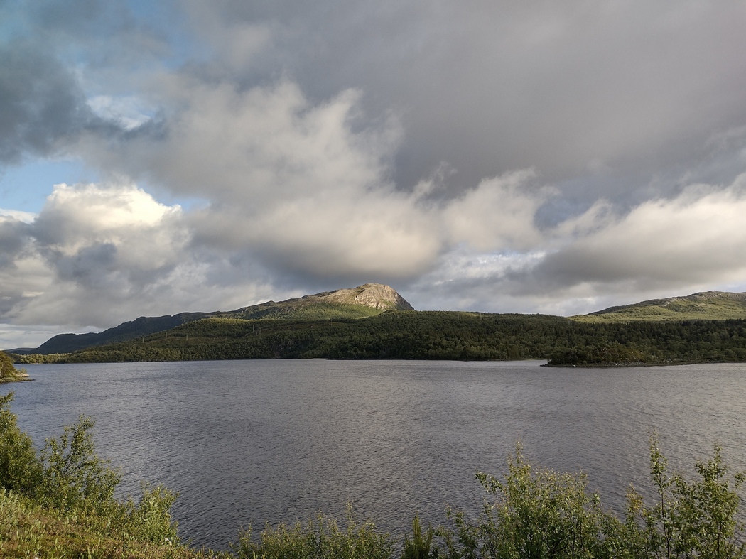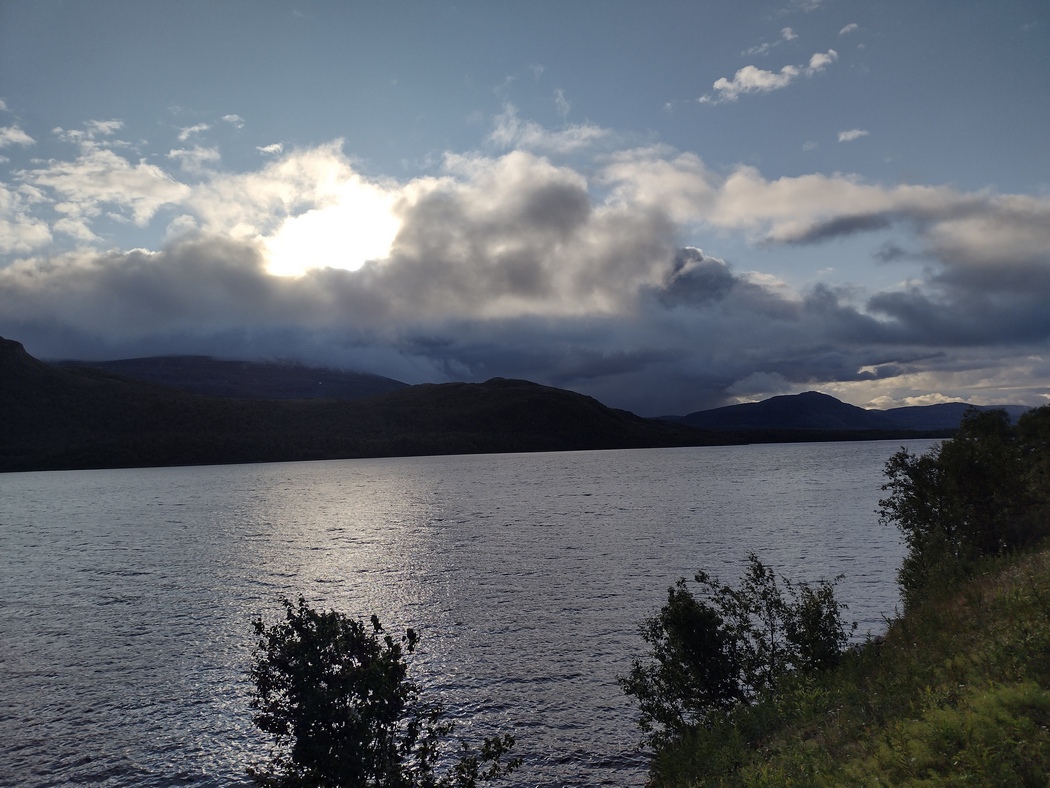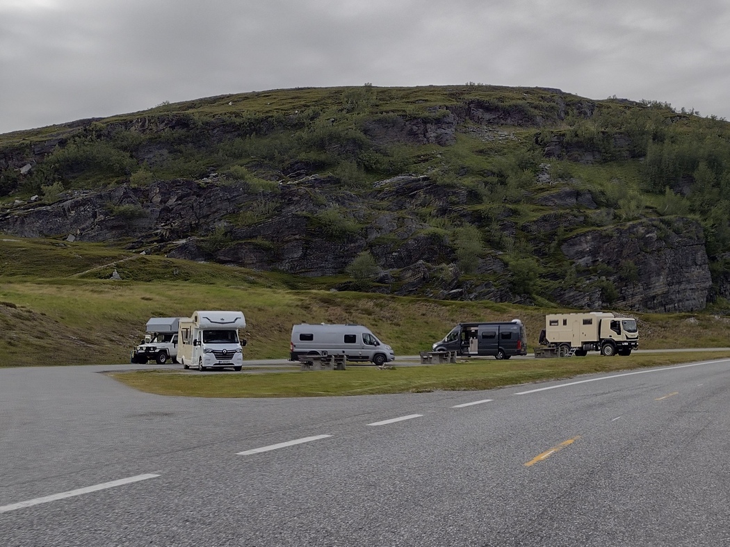 Kurz darauf erreichte ich wieder Olderfjord, wo ich in Richtung Westen abbog, um Kurs auf Alta zu nehmen. Da dieser Kurs mit einem spürbaren Anstieg verbunden war, kam ich dann nicht mehr sonderlich weit an diesem Tag. An einem Schotterweg, der laut Karte zu mehreren kleinen Seen führte, entschied ich mich mir ein Nachtquartier zu suchen. Natürlich war ich nicht der erste dem dieser Gedanke kam, ein Ehepaar aus dem Voigtland stand mit seinem Wohnmobil um die Ecke und winkte verständnislos ab, als ich bei einem kurzen Gespräch meine bisherige Reise skizzierte. Wenige Meter weiter war eine kleine Sommerhütten-Siedlung und ich war schon drauf und dran mein Zelt auf einer Veranda aufzuschlagen. Das kleine Vordach war jedoch nicht im Stande einen ernstzunehmenden Schutz gegen den drohenden Regen zu gewährleisten und so erschien es mir ratsamer, mich in der Nähre einer Wasserquelle niederzulassen. Auch mein Platz zwischen Weg und See bot nur aus einem eingeschränkten Bereich an Blickwinkeln scheinbare Einsamkeit. In Norwegen war das nächste Wohnmobil eigentlich so gut wie immer in Sichtweite.