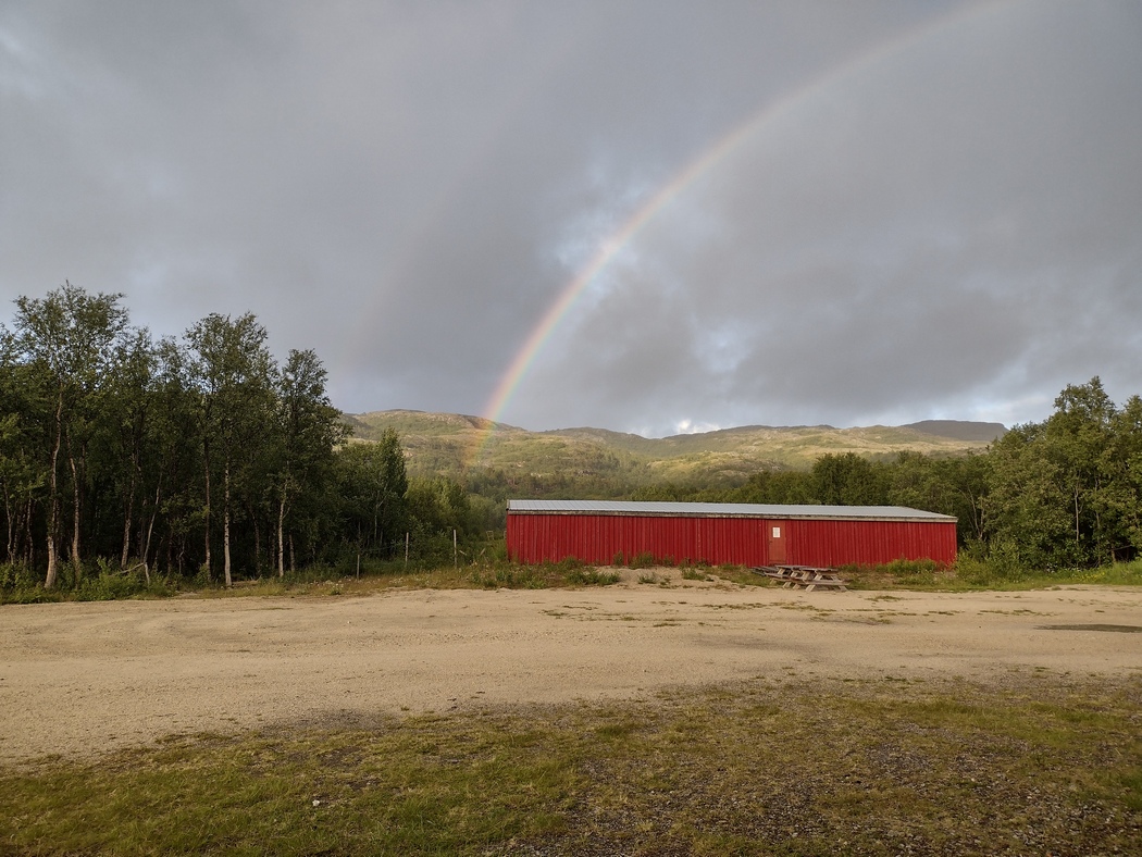 Es war von Vorneherein nicht sehr realistisch gewesen an diesem Tag, wenn auch erst um Mitternacht, das Nordkapp zu erreichen und als es um 19 Uhr nach 120 km auf yr.no hieß, es würde ab 20 Uhr regnen, gab ich den Plan schließlich auf. Gerade war ich im Dörfchen Stranda gestrandet und fasste nun den Plan mich in eine Garage oder Bootshütte einzuzecken. Aufgrund des schlechten Wetters waren freilich nicht viele Menschen draußen unterwegs und so fuhr ich zum gefühlt letzten Haus des Ortes, wo tatsächlich jemand an seiner Hütte herumwerkelte. Ich versuchte es zunächst mit einem Angebot: „Do you need a helping hand?“ Nein, brauchte der ältere Herr nicht. Die Hütten seien alle belegt, da sei nichts zu machen. Drei Kilometer südlich sei der Abzweig nach Repvag, da gäbe es ein Gästehaus. Das hatte ich natürlich wahrgenommen, aber keine Lust gehabt 100 Euro für eine Koje im Dorm auszugeben und erklärte daher ich wolle unter keinen Umständen zurück fahren, jeden Zentimeter zum nicht mehr allzu fernen Ziel und letzten Meilenstein müsse man sich schließlich hart erarbeiten. „What can I do for you? You could maybe stay in the garage…“ „OK, cool, thanks!“