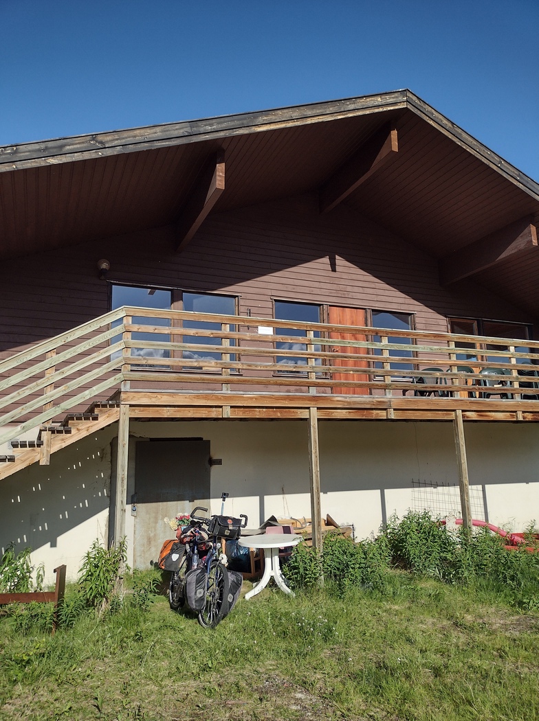 Daher rasch alles zusammen gepackt und wieder aufs Rad. Dieser Aufbruch war allerdings gleichermaßen blauäugig wie überstürzt, denn es dauerte nicht lange, bis es wieder kräftig regnete doch ich hatte keine Regensachen angelegt. Im Nullkommanichts war ich nass bis auf die Knochen und nirgendwo gab es irgendeine Gelegenheit sich kurz unterzustellen. Erst als die intensivste Phase des Wolkenbruchs bereits abgeklungen war, fand ich eine Hütte an deren Wand ich mich zumindest im Luv befand und so mühsam eine Notgaderobe anlegen konnte. Nach ein paar weiteren Kilometern Nieselregen klarte es auf und im selben Moment tauchte eine derzeit offenbar unbesuchte Sommerhütte auf, auf deren überdachter Veranda eine bequeme Bank stand und deren Schuppen offen stand und sich durchaus als Nachtlager geeignet hätte. Aber jetzt, wo es aufgehört hatte zu regnen, könnte man ja auch noch weiterfahren, je nördlicher man kam, desto weniger spielte die Tageszeit ja eine Rolle und so spät war es natürlich auch noch gar nicht.