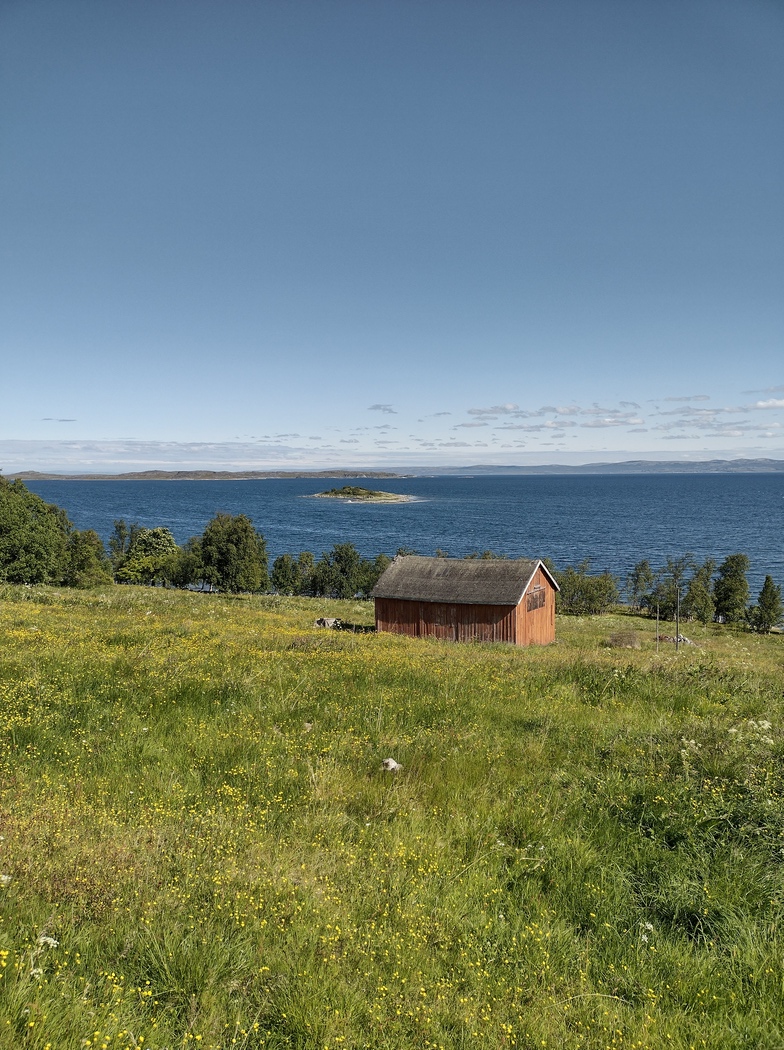 Danach wollten die beiden Saufkumpanen mich nicht gleich entlassen, sondern mir noch das ein oder andere mit auf den Weg geben. Zunächst solle ich mir gewahr sein, dass ich mich bald in die Arktis begebe. Bis Olderfjord (noch ca. 60 km) sei ja alles noch harmlos. Ab dort jedoch beginne der harte Teil und falls das Wetter nicht mitspiele, könne ich mich in Lebensgefahr begeben. Es solle schon vorgekommen sein, dass Radfahrer*innen auf dem Weg von Olderfjord ans Nordkapp bei einem plötzlich auftretenden Blizzard erfroren seien. Sofern Nordwind vorherrsche, solle ich keinesfalls weiterfahren und stattdessen auf einem Campingplatz den Wetterumschwung abwarten. Sein Kumpel hingegen versprach mir freien Räucherlachs in einem Restaurant in 50 km. Beide hielten sich jedoch gegenseitig für Dummschwätzer und gaben sich gegenseitig Nackenschellen. Schließlich schärften sie mir noch ein, dass man in Norwegen aus jedem fließenden Gewässer trinken könne, aus jedem! Ihr Leitungswasser war dennoch natürlich das Beste des gesamten Landes, eine Einschätzung die wir schon zuvor in anderen Ländern gehört hatten und auch später noch hören sollten. Für ein gemeinsames Selfie stand der Einladende nicht zur Verfügung, steckte mir aber noch ein Dosenbier zu, als ich es schließlich schaffte, mich loszureißen und in Richtung Porsangerfjord aufzubrechen.