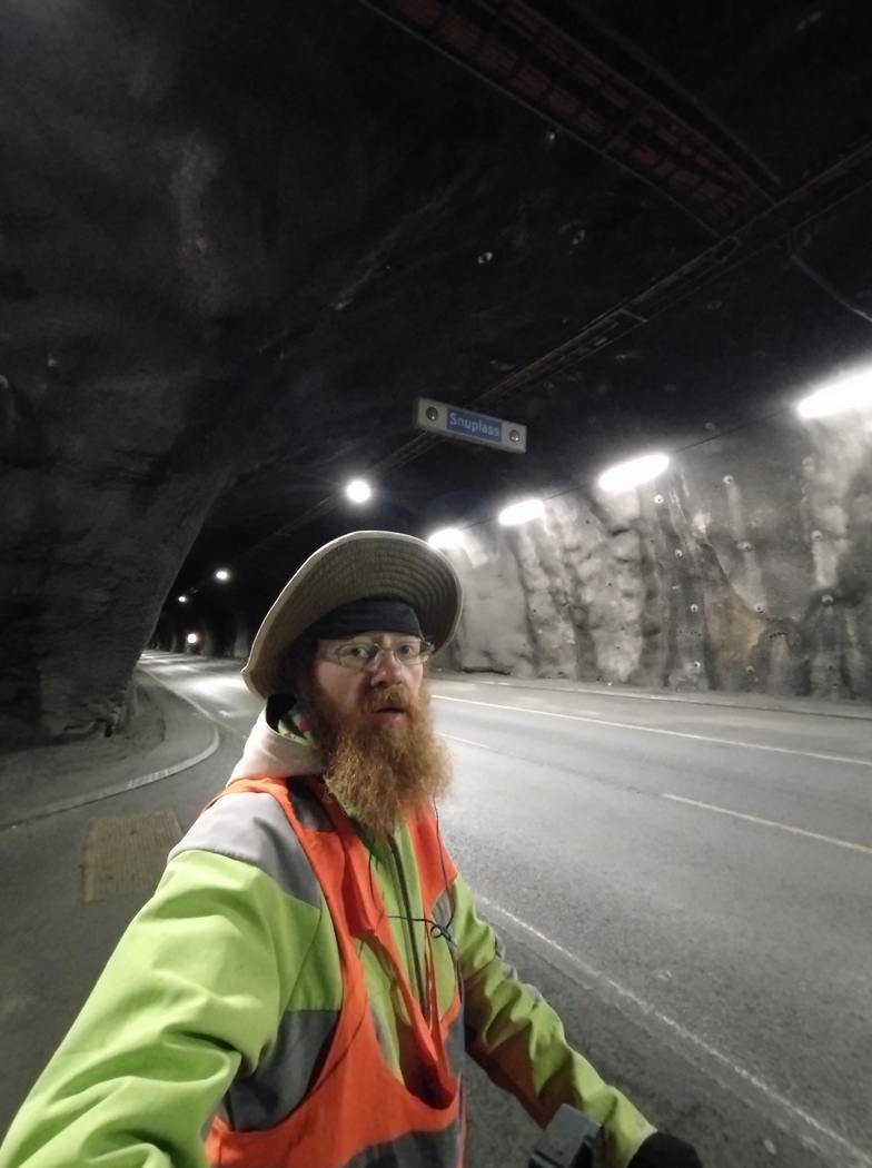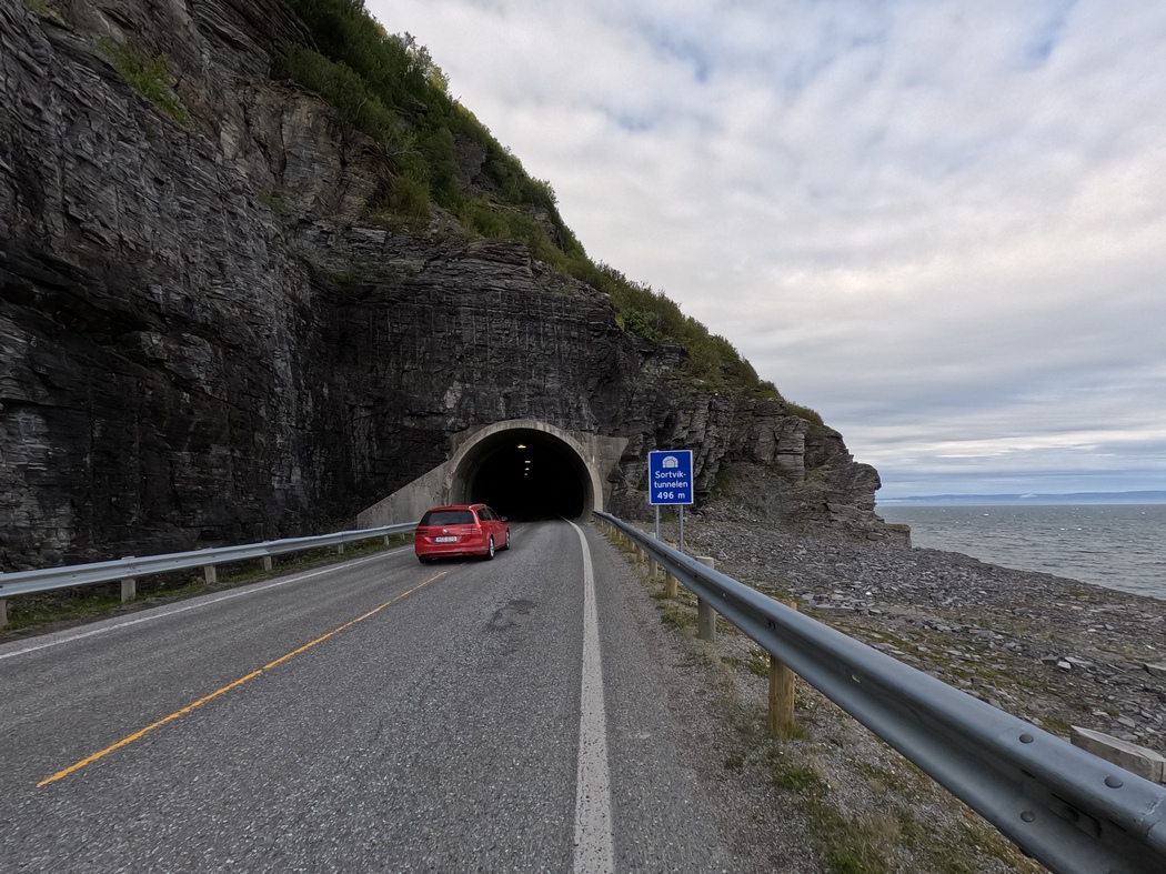 Nur wenige Kilometer weiter, kurz vor Honningsvag, überraschte mich dann schon gleich der nächste Tunnel, von dem bisher nie die Rede gewesen war. Da ich beim Hineinfahren aufgrund der Kälte die Augen voller Tränen gehabt hatte, hatte ich doch glatt gedacht eine Länge von 400 m entziffert zu haben. Tatsächlich stellte ich bald meinen Irrtum fest, eine Null war der Tränenflüssigkeit zum Opfer gefallen. Auch hier fehlte ein Fahrradstreifen und auch hier kam das Profil nicht ohne Steigung und Gefälle aus. Dass niemand über diese Nervensäge sprach, lag wohl einzig und allein an dem dominanten Charakter seines großen Bruders, ansonsten hätte auch er großes Potenzial unter Radfahrer*innen moderaten Angst und Schrecken zu verbreiten.
