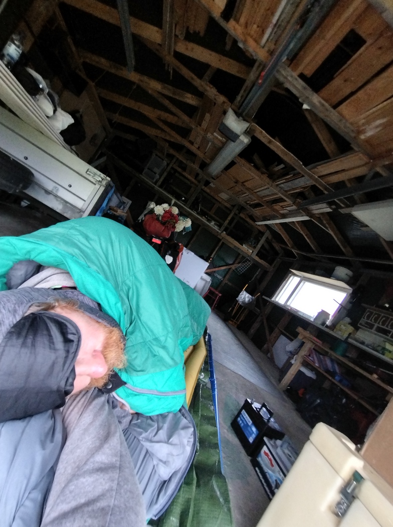Der Ölgestank allerdings war dann doch so penetrant, dass ich das Garagentor die ganze Nacht geöffnet ließ und das Feldbett sogar an die Außenkannte rückte, gerade so dass ich nicht vom Regen behelligt wurde.