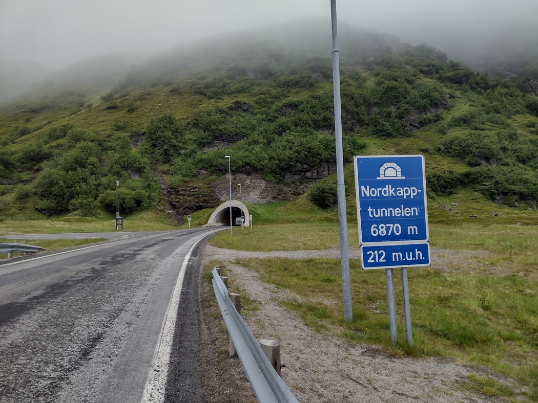 Ich war inzwischen jedenfalls am berühmt berüchtigten Nordkapptunnel angekommen, der unterhalb des Nordmeers vom norwegischen Festland auf die Insel Magerøya führt. Um unter das Meer zu gelangen, geht es erst mit 9% Gefälle 200 m bergab, nur um kurze Zeit später mit 9% Steigung wieder 200 m bergauf zu gehen. Das ganze spielt sich auf einer Länge von knapp 7 km ab.