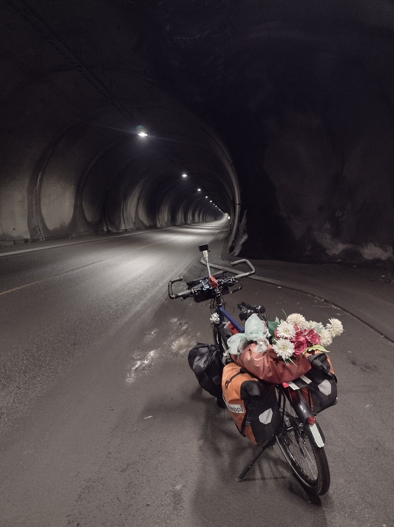 Nach einer Weile kam aus Richtung Norden ein gigantisches Zweirad angerollt, dessen Vorne und Hinten lediglich anhand der Bewegungsrichtung auszumachen war, denn nichts erinnerte an den typischen Aufbau eines Fahrrades. Angelito aus Berlin war auf diesem Ungetüm eines umgebauten Postfahrrades unterwegs und sichtbar stolz auf seine Konstruktion. Mir erschien der umfangreiche genutzte Stauraum einmal mehr etwas übertrieben, zumal er sich nicht auf einer Weltumrundung, sondern „lediglich“ auf einem Trip zum Nordkapp und zurück befand. Dass er es mit Gefährt und Beladung durch den Tunnel geschafft hatte, war natürlich dennoch eine beachtliche Leistung. Er wollte jetzt jedenfalls 12 Stunden warten, bis er den Rückweg antrat, nachts sei schließlich so gut wie kein Verkehr.