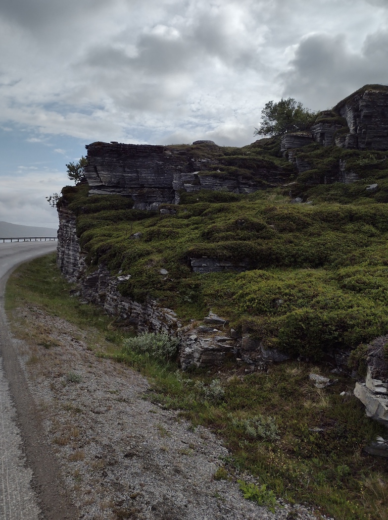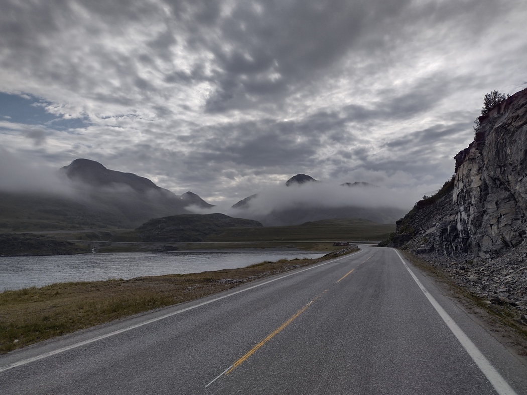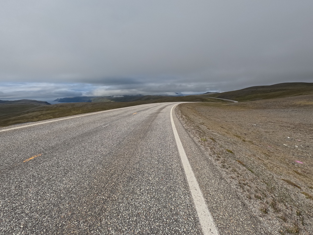 Als ob der Bier-Duschen-Dude aus Lakselv hellsehen könnte, wurde es kurz hinter Olderfjord tatsächlich zunehmend ungemütlich. Die Landschaft wurde auch bald karger bis alle Blütenpracht und schließlich auch alle Bäume verschwunden waren. Es wurde nun richtig kühl und die Sicht trübte sich, während sich die Feuchtigkeit getrieben vom Wind allmählich durch das Gewebe arbeitete.